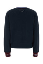 Elevate your casual wardrobe with this sophisticated melange dark blue cotton sweatshirt from Prada. Crafted from premium cotton, this pullover features a classic crew neckline and long sleeves with distinctive striped ribbed cuffs and hem in burgundy and white.