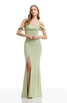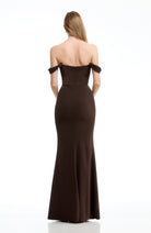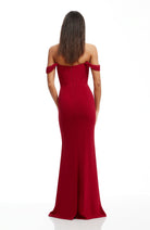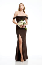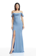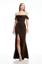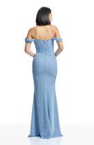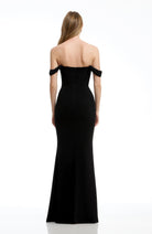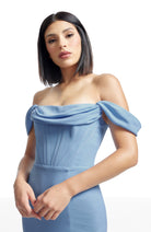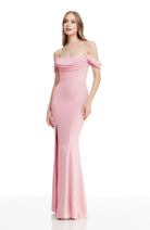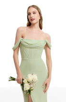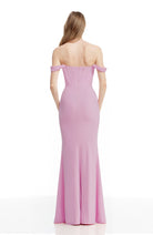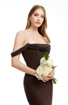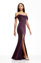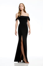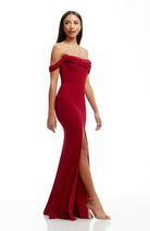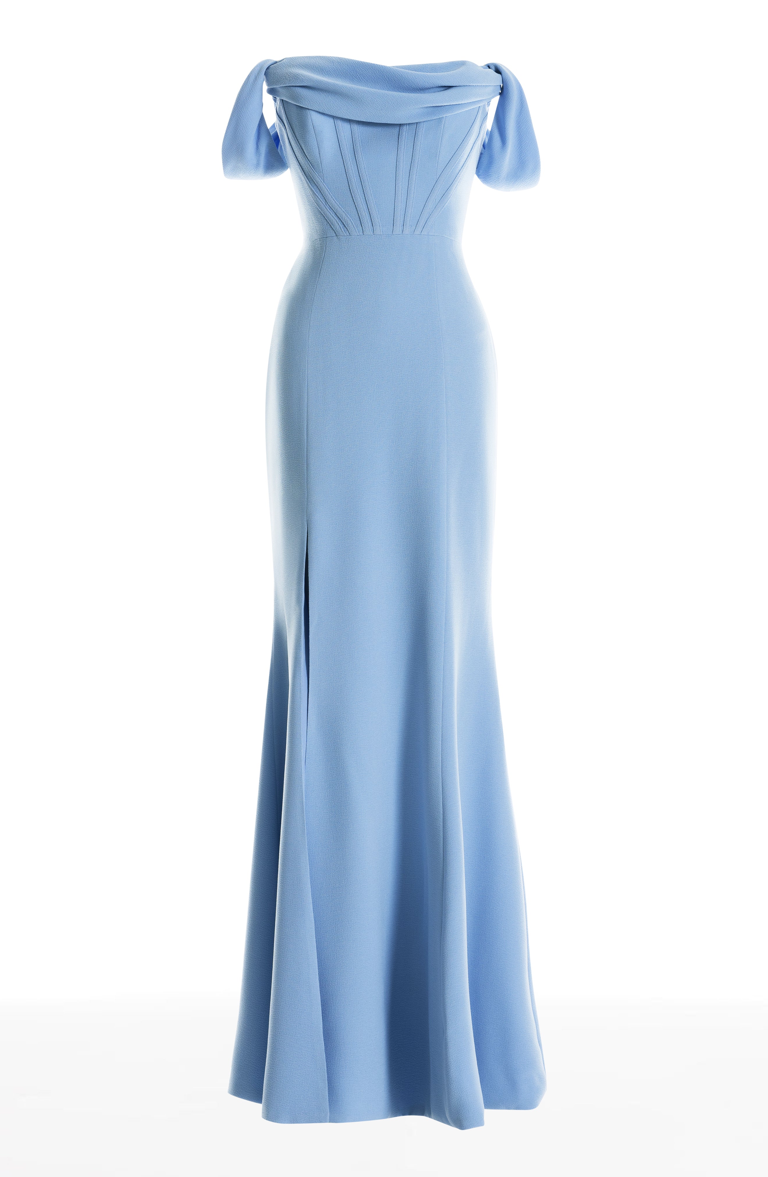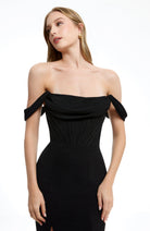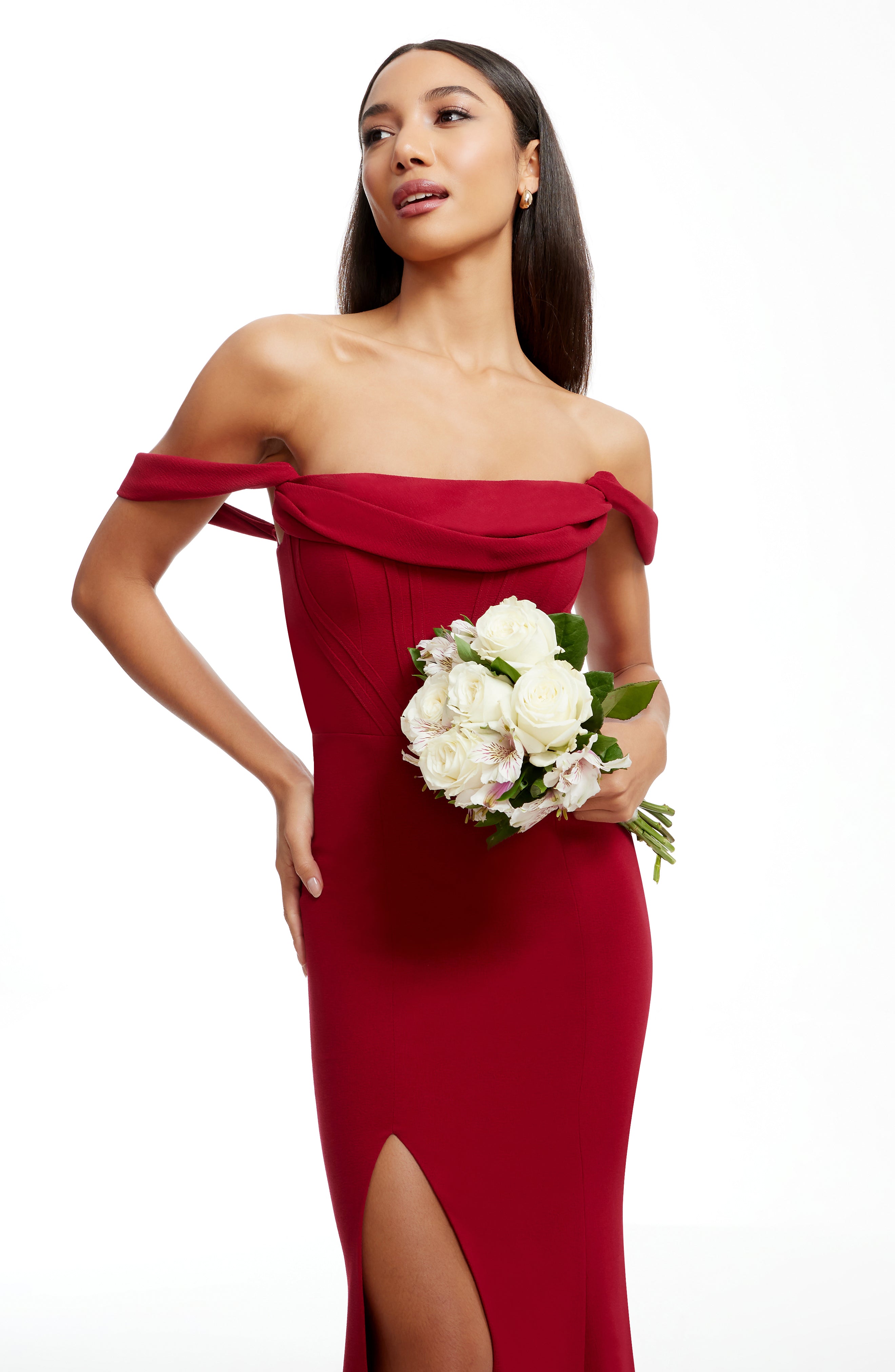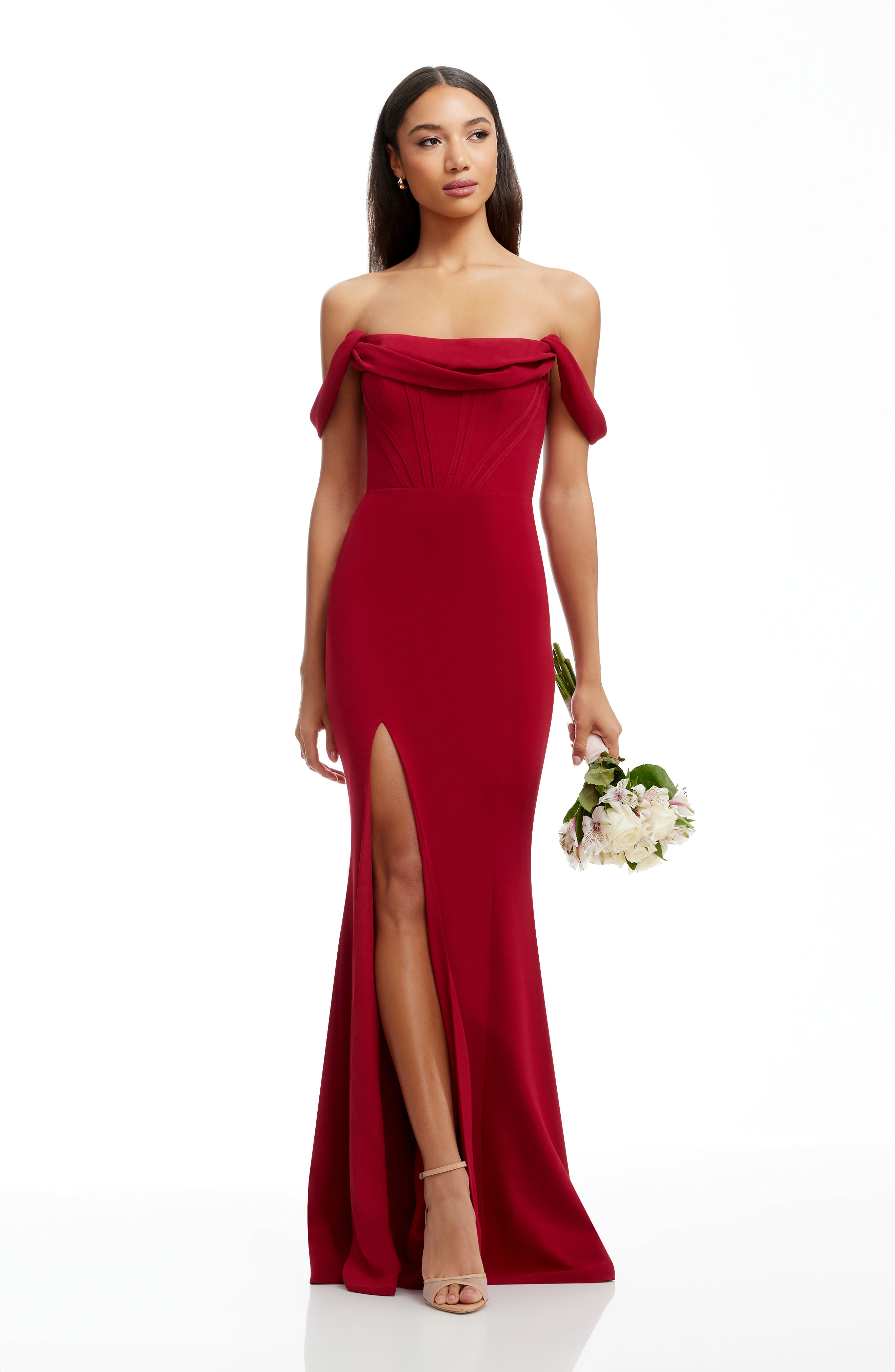 A stunning off-the-shoulder dress featuring exposed boning and a draped mermaid silhouette with a slit accent.