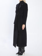 MAXI COAT IN BLACK VIRGIN WOOL. FEATURES CLASSIC LAPELS, TWO FRONT WELT POCKETS, REMOVABLE BELT, BELT LOOPS, AND A CENTRAL BACK VENT. LINED IN CUPRO. REGULAR FIT.