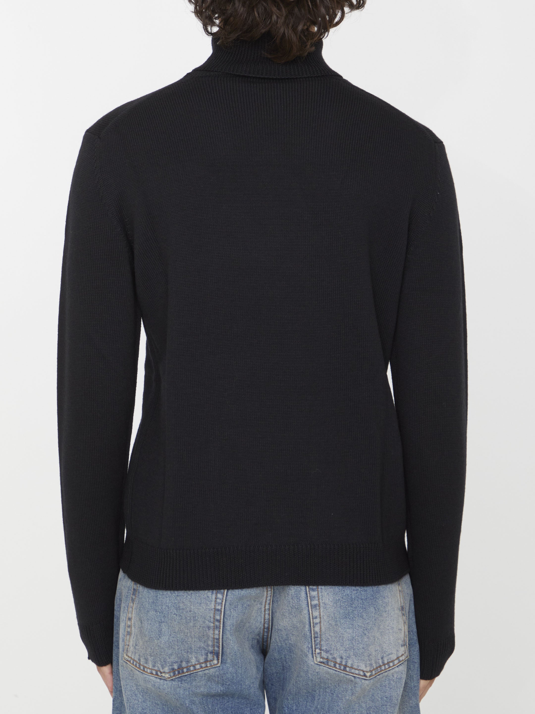 High-neck jumper in black merino wool with ribbed design. Regular fit.