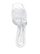 SILVER-TONE CALF LEATHER METALLIC FINISH SEAL-LOGO EMBOSSED EFFECT SQUARE OPEN TOE BRANDED FOOTBED LOW BLOCK HEEL LEATHER OUTSOLE SLIP-ON STYLE
