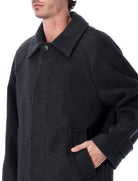 CUT FROM POST-CONSUMER RECYCLED LODEN WOOL SPUN BY THE RENOWNED ITALIAN MILL MANTECO, IT FEATURES AN OVERSIZED SILHOUETTE WITH RAGLAN SLEEVES, HIDDEN BUTTON CLOSURE, AND A REMOVABLE STORM TAB.