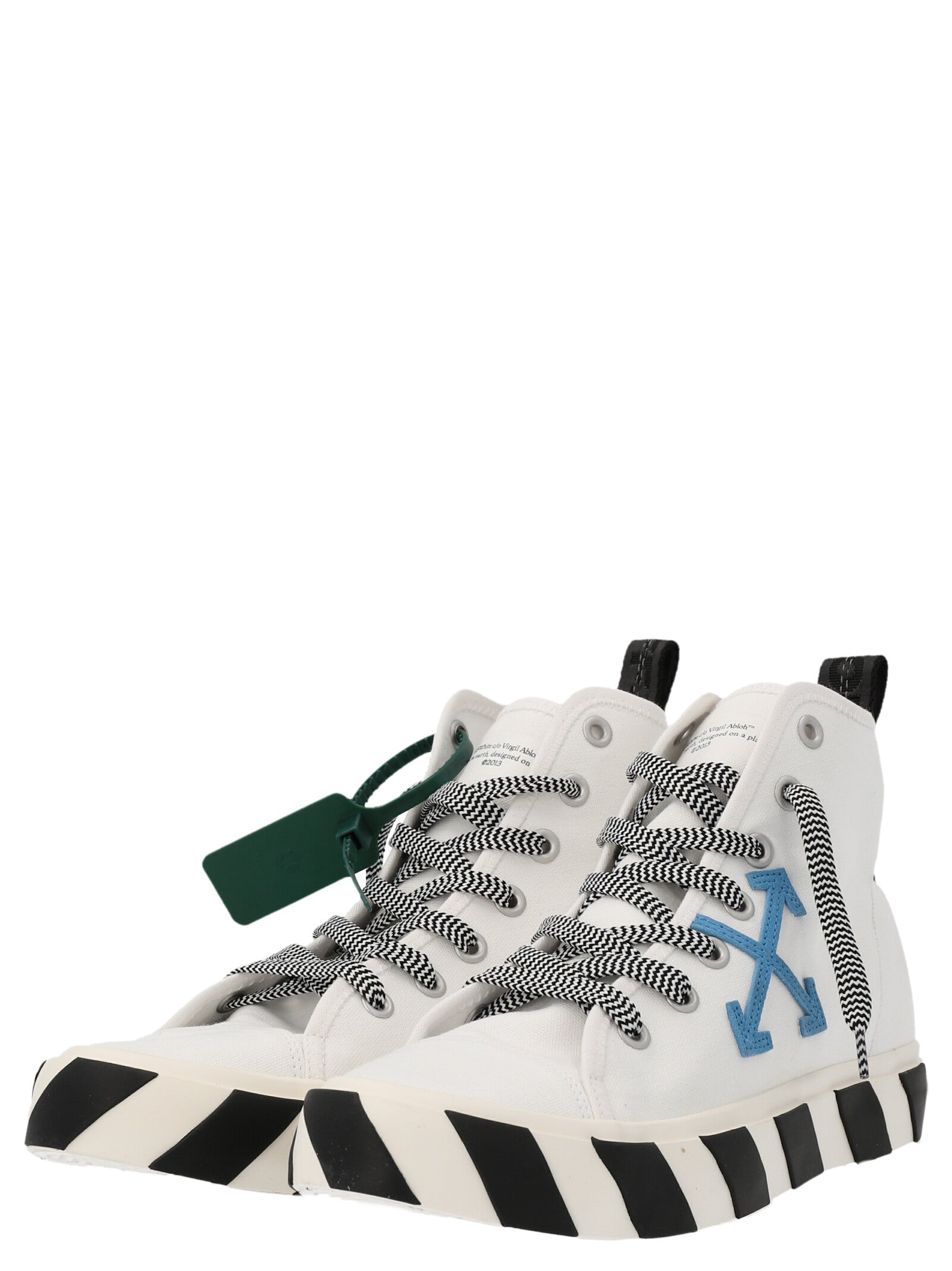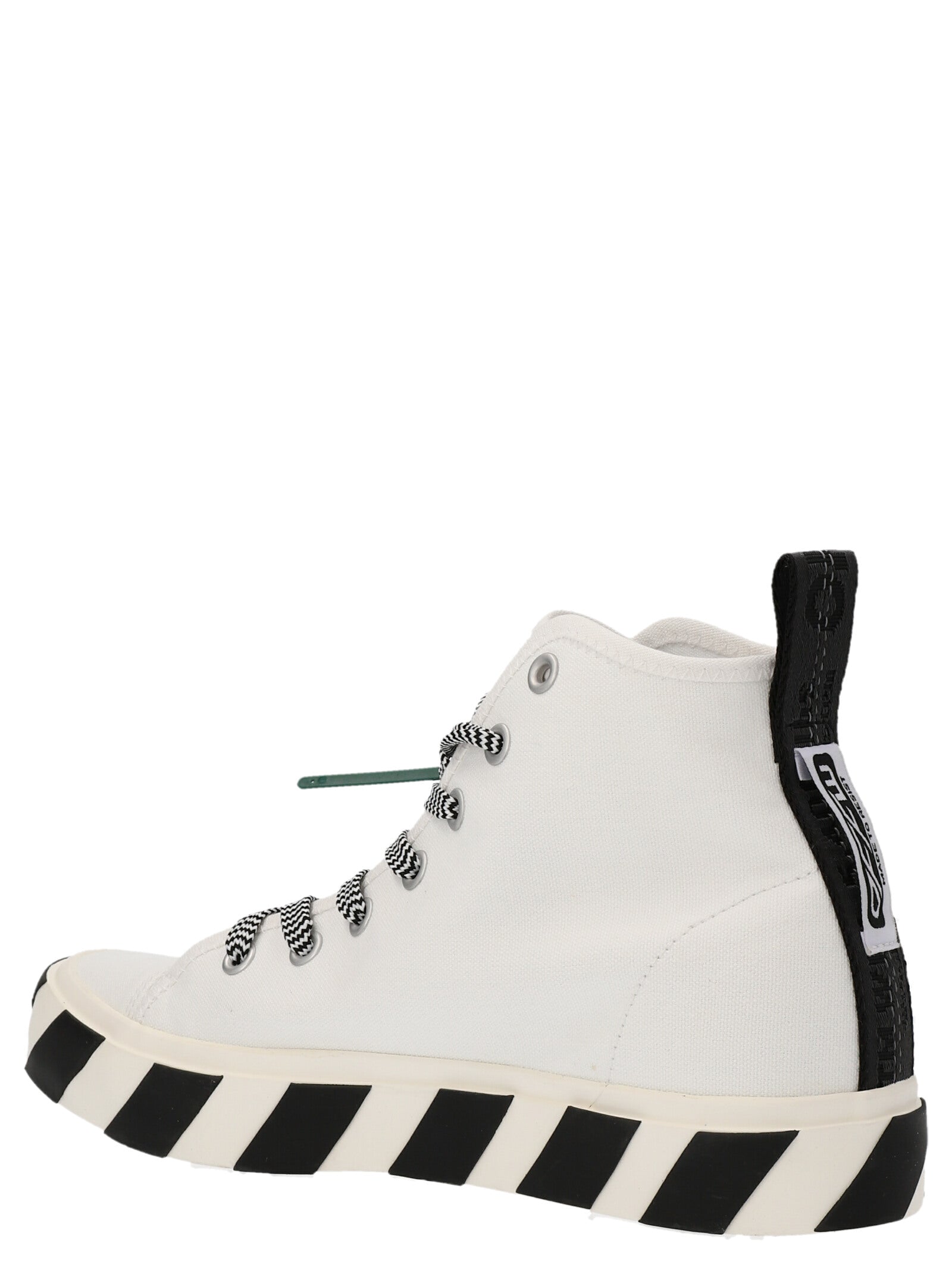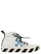 Elevate your sneaker game with these 'Mid Top Vulcanized' sneakers from Off-White. Crafted from premium canvas with luxe leather details, these high-tops feature the brand's signature side logo application and distinctive diagonal-striped rubber sole. The lace-up design with contrasting green laces adds a pop of color to the clean white silhouette.