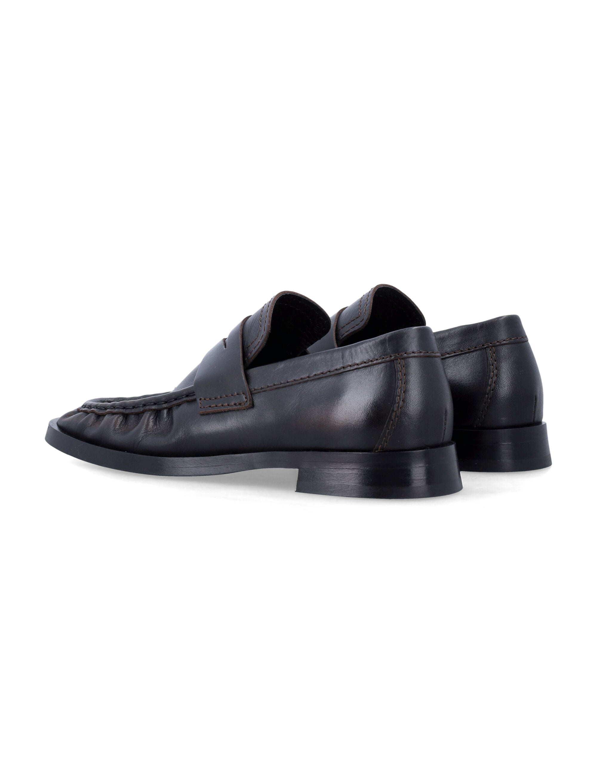 CRAFTED IN BROWN BRUSH-OFF DOUBLE-TANNED LEATHER FOR A VINTAGE PATINA, THEY FEATURE A PIPED AND RUCHED ROUNDED TOE WITH A SLIM PROFILE AND LOW RUBBER HEEL.