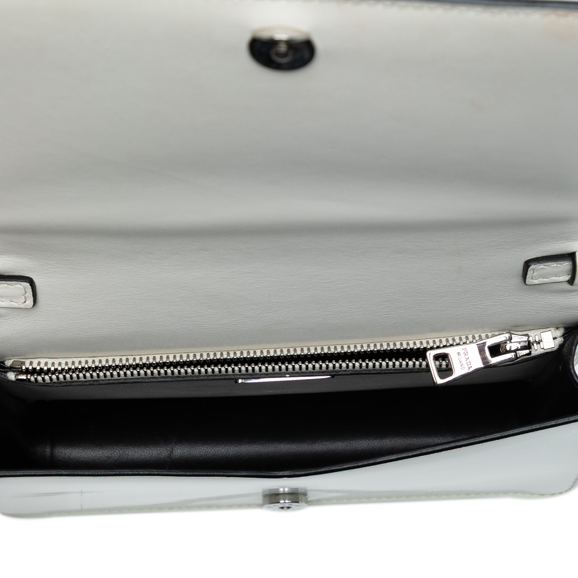 This crossbody features a leather body, a silver-tone chain shoulder strap, a front flap with magnetic snap closure, and an interior zip compartment.