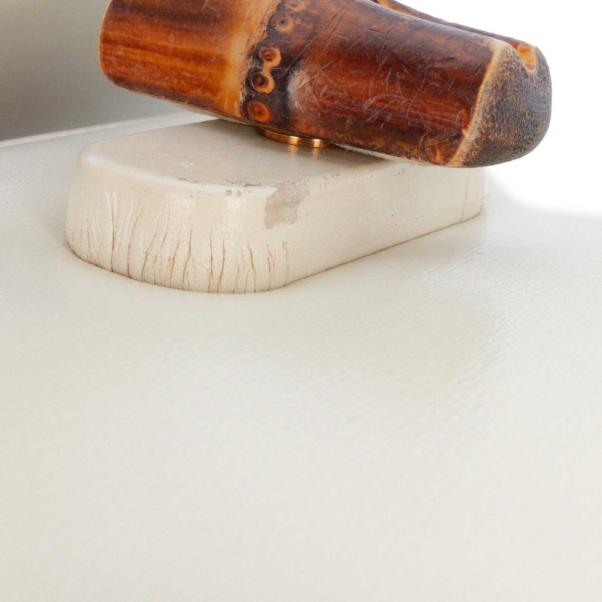This satchel features a leather body, a bamboo top handle, a detachable flat canvas strap, a front flap with a bamboo twist lock closure, and an interior slip pocket.