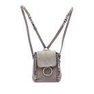 The Mini Faye backpack features a leather body with zip details, adjustable flat back straps, a detachable shoulder strap, a suede front flap with a hook closure, and an interior slip pocket.
