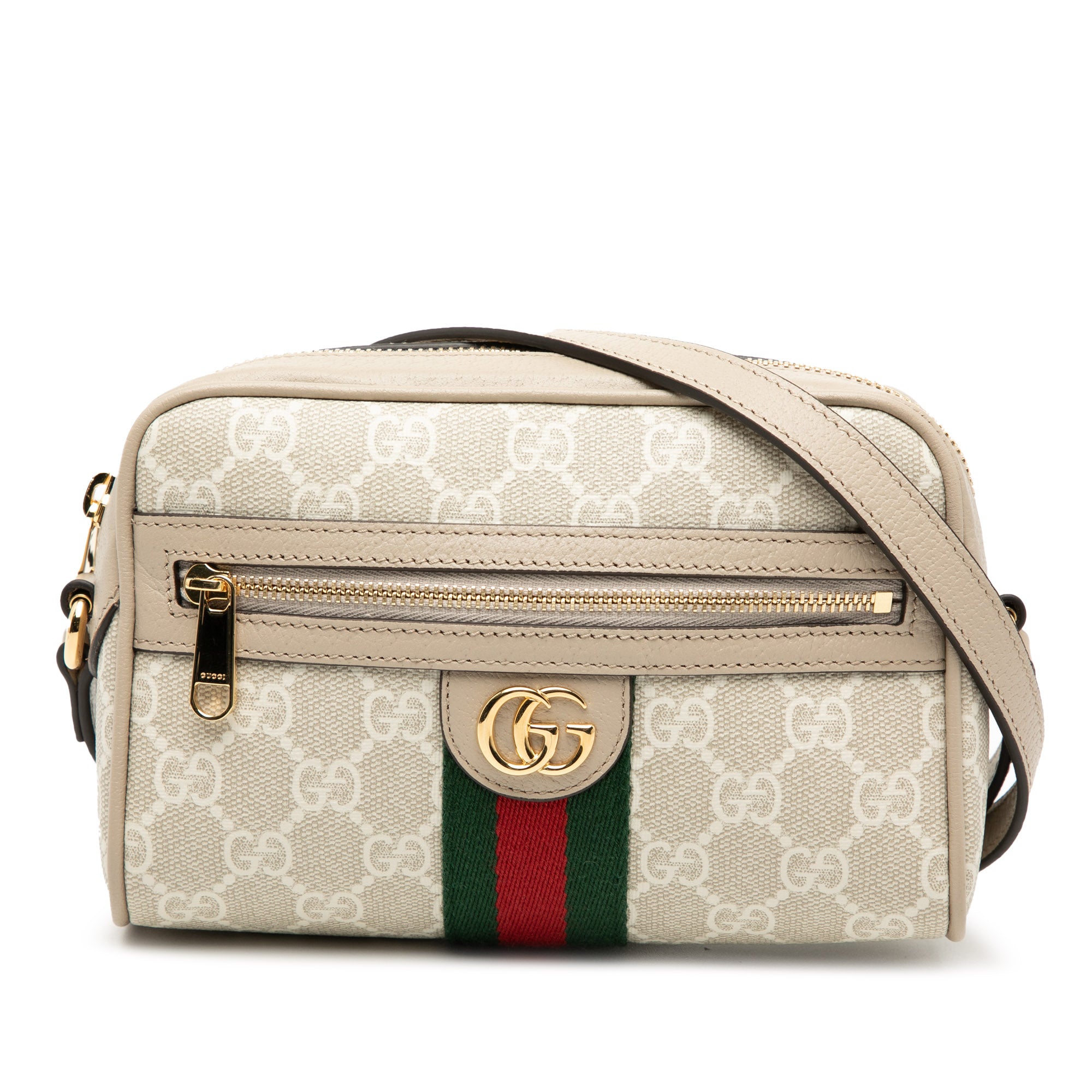 The Ophidia Crossbody features a coated canvas body with leather trim, a flat leather strap, an exterior zip pocket, top zip closure, and an interior slip pocket.