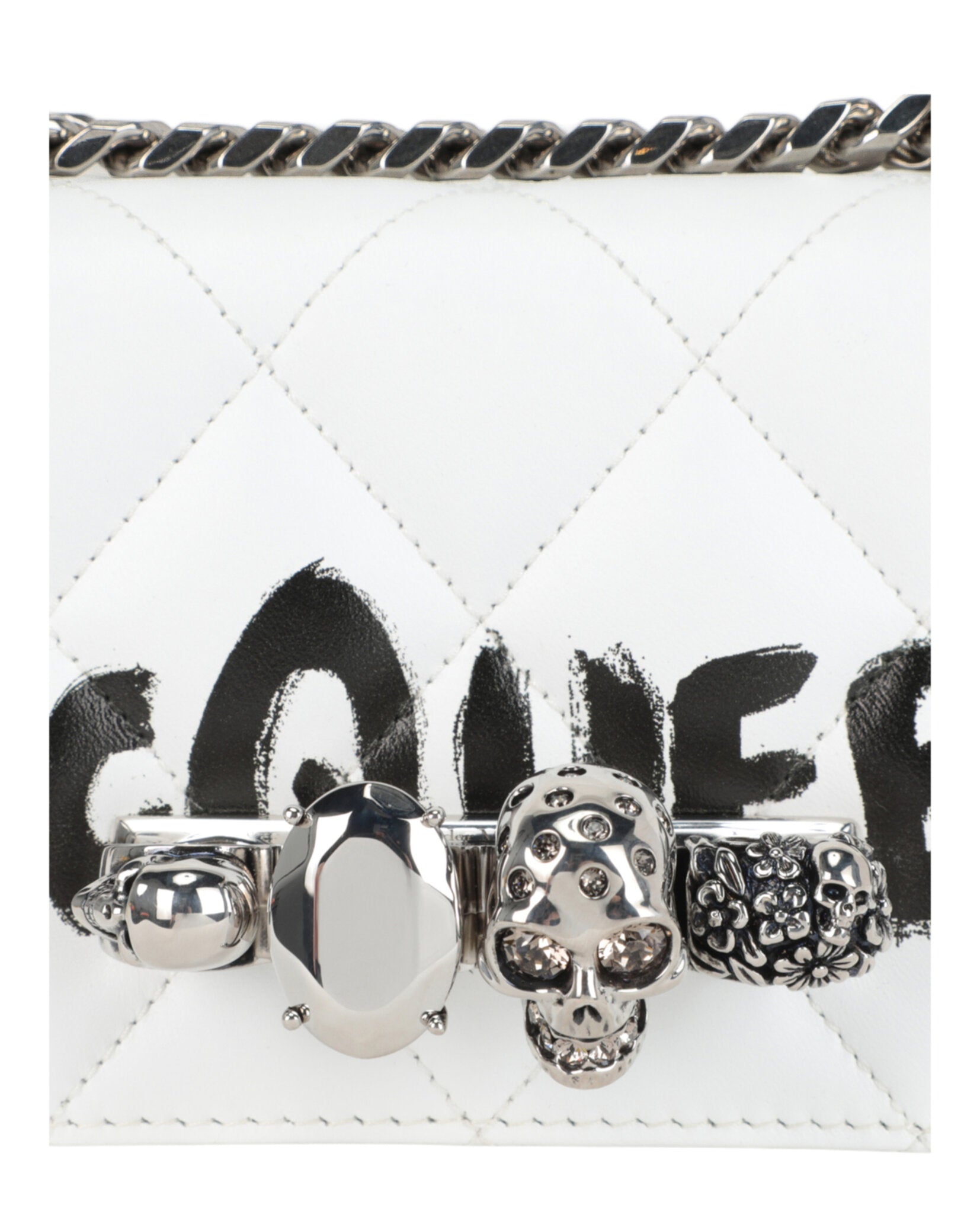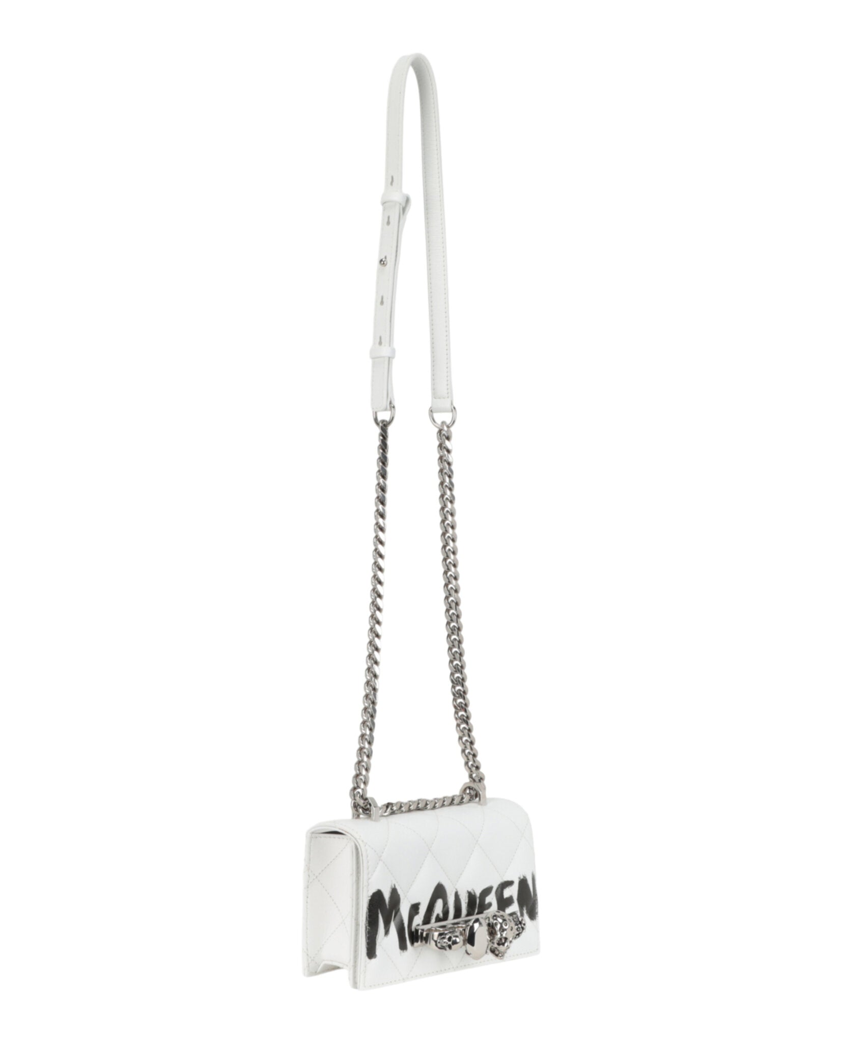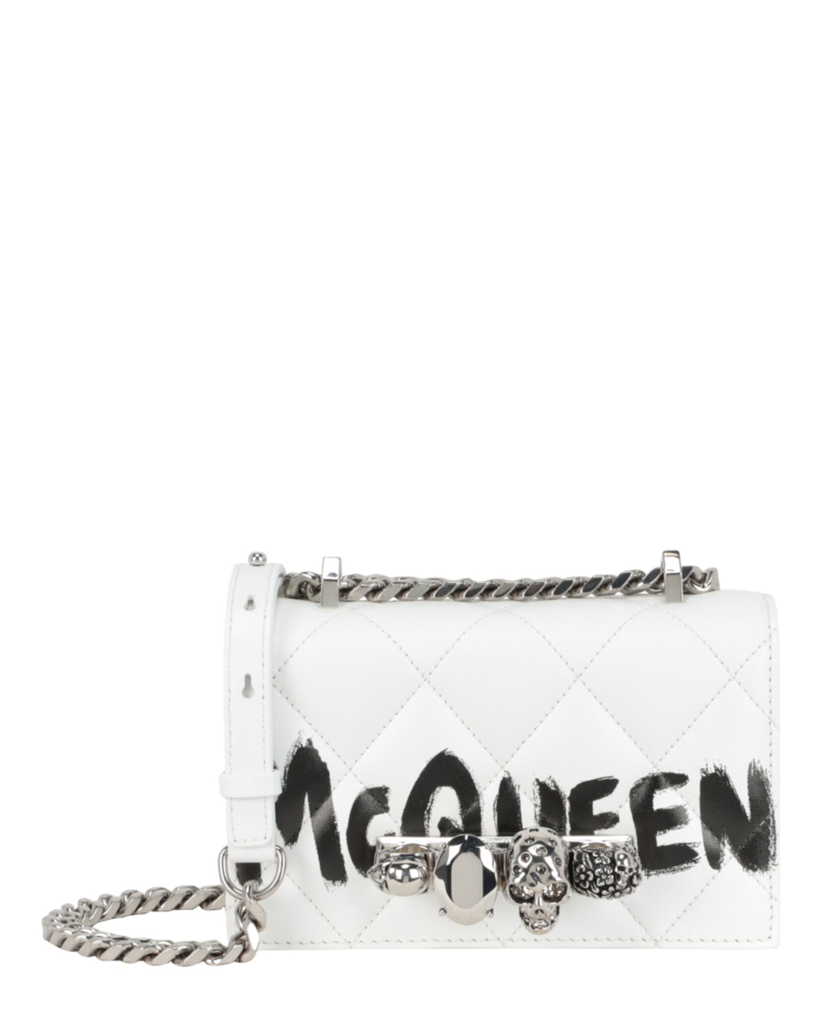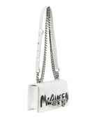 Make a bold statement with the Mini Graffiti Jeweled Shoulder Bag from Alexander McQueen. This luxurious Italian-crafted accessory features the brand's signature graffiti logo emblazoned across pristine white calfskin leather, creating an edgy yet sophisticated aesthetic.