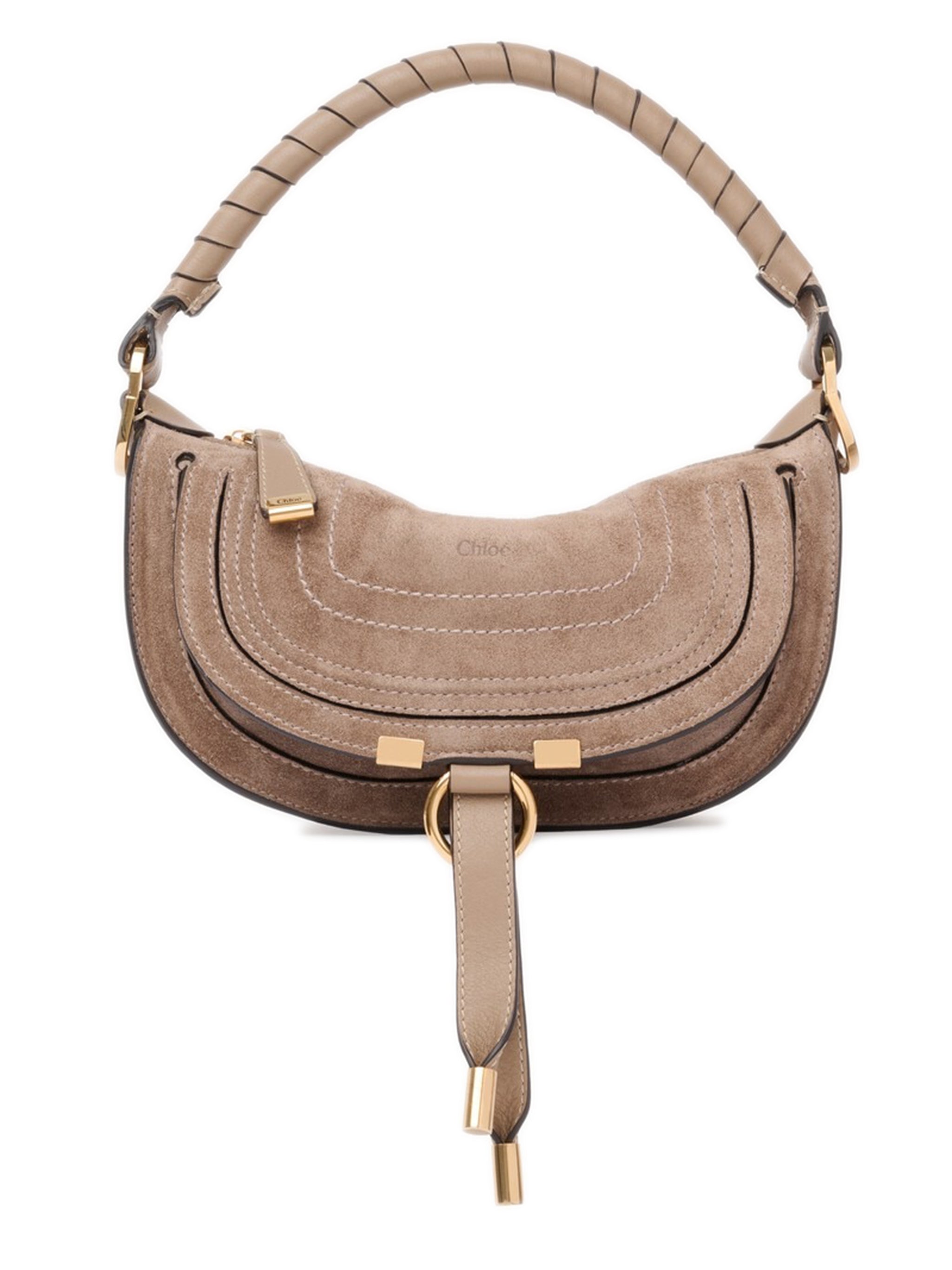 Introducing the Chloé Mini Marcie Tote Bag in a beautiful fawn neutral tone. This iconic handbag features exquisite topstitch detailing that highlights its curved, saddle-inspired silhouette, while the wrapped top handle adds a sophisticated touch of texture and comfort.