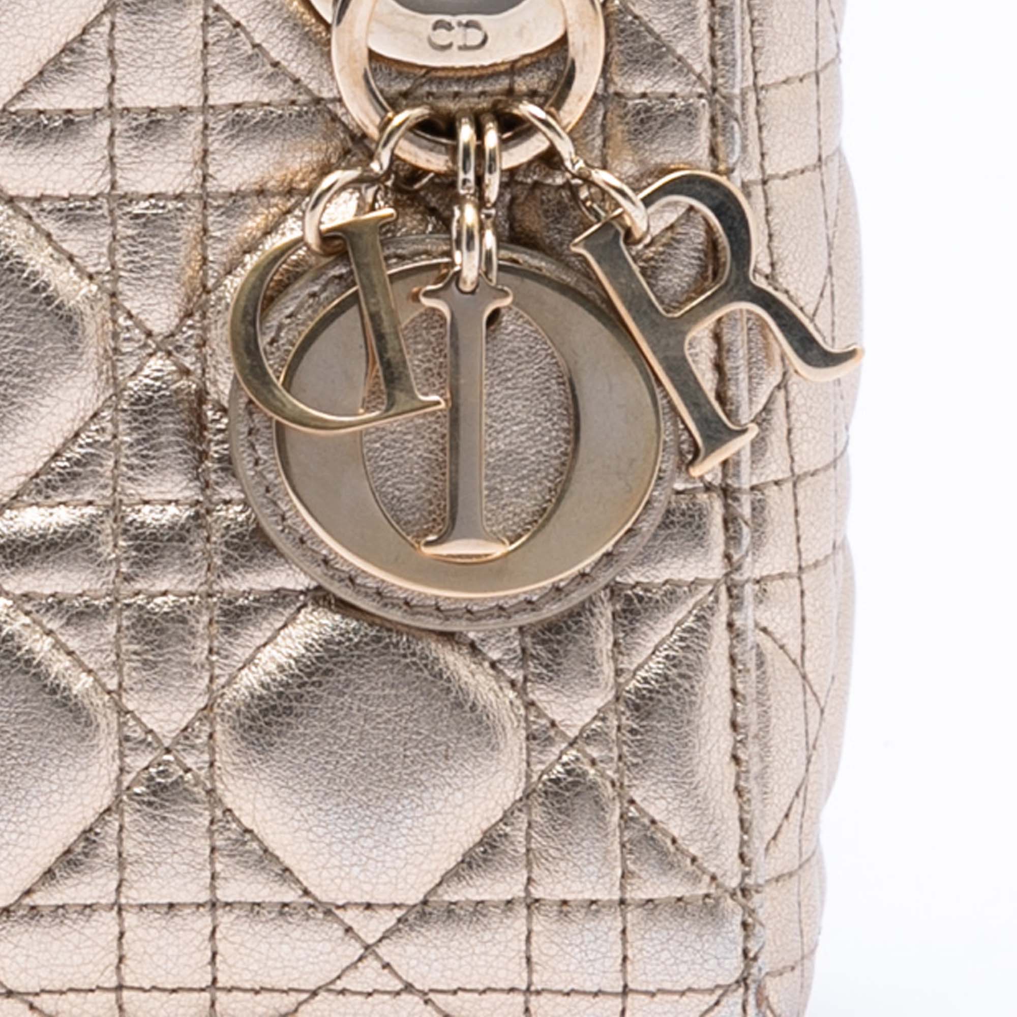 The Mini Lady Dior features a quilted metallic lambskin leather body, flat leather top handles, a detachable chain-link strap with leather shoulder guard, a fold-in flap closure, and an interior zip pocket.