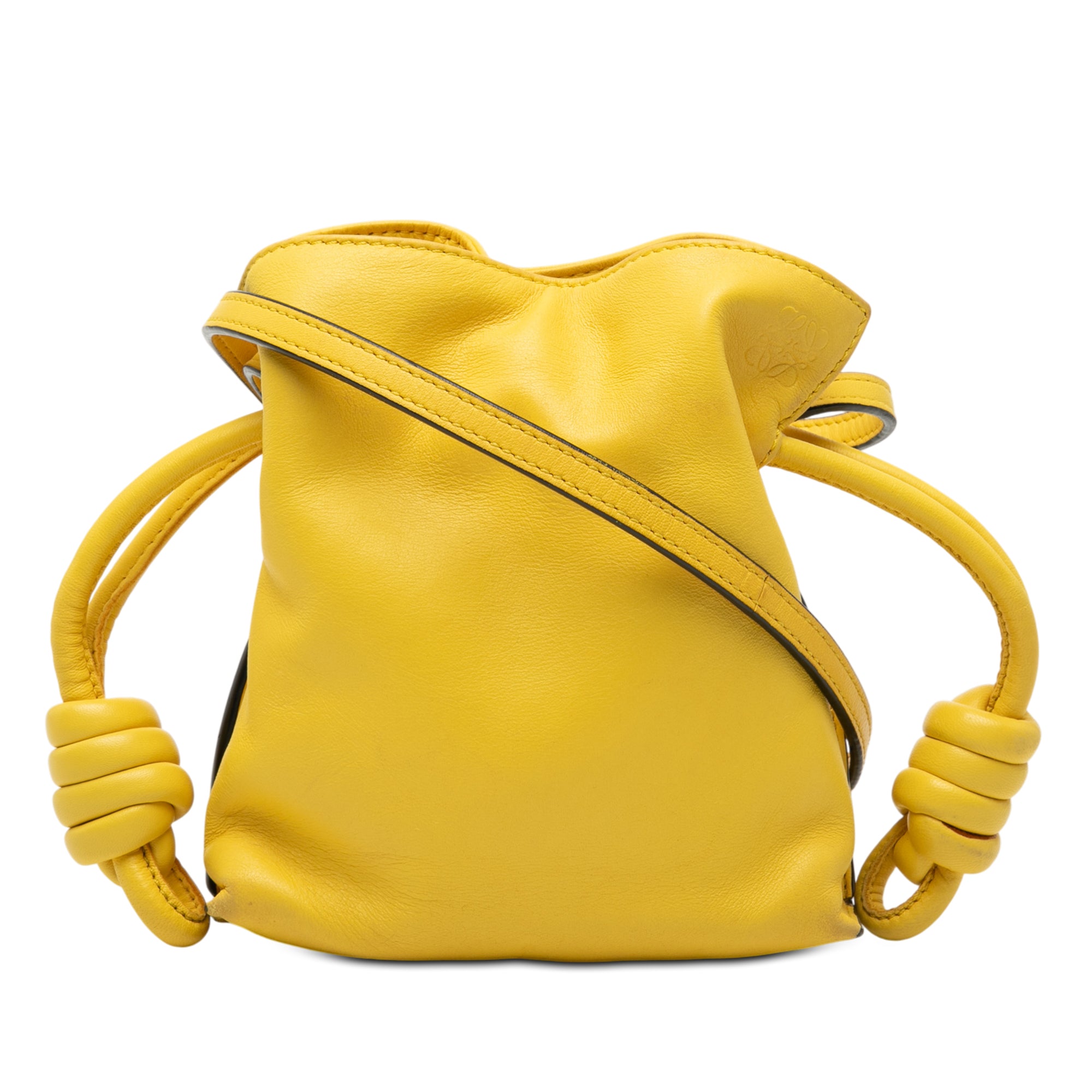 The Mini Flamenco Knot crossbody features a nappa leather body, a flat leather strap, and an open top with a drawstring pull finished in signature coiled knots.