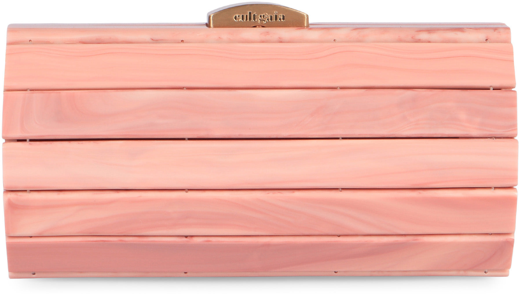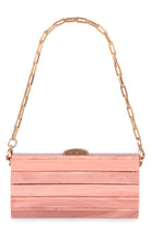 A CYLINDRICAL POUCH MADE OF MARBLED PINK ACRYLIC WITH A FLAT BOTTOM AND A REMOVABLE CHAIN STRAP. THE TOP CLOSURE IS ELEGANT AND FUNCTIONAL, ENSURING THE SAFETY OF THE ITEMS INSIDE. THE INTERIORS OFFER AMPLE SPACE FOR CREDIT CARDS, BANKNOTES, AND COINS, MAKING IT PRACTICAL FOR EVERYDAY USE. PERFECT FOR COMPLETING CASUAL OR MORE FORMAL LOOKS, THIS WALLET IS A VERSATILE ACCESSORY FOR ANY OCCASION.