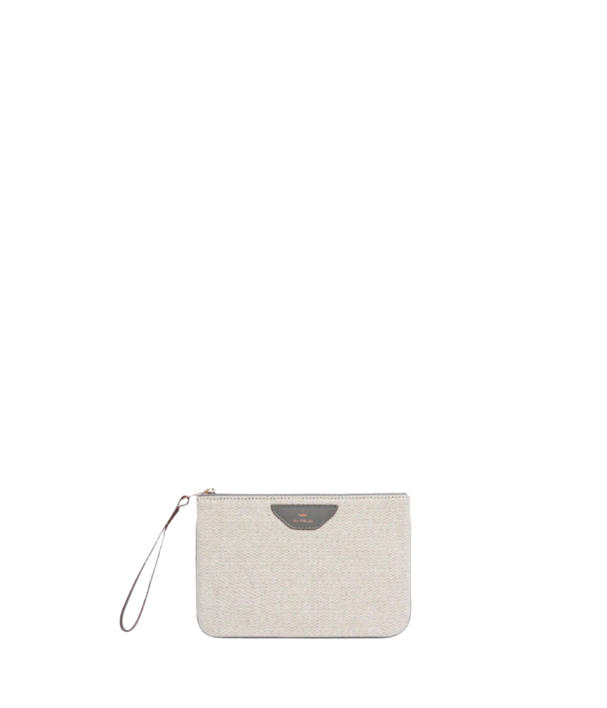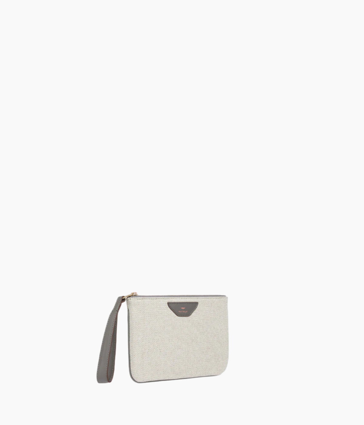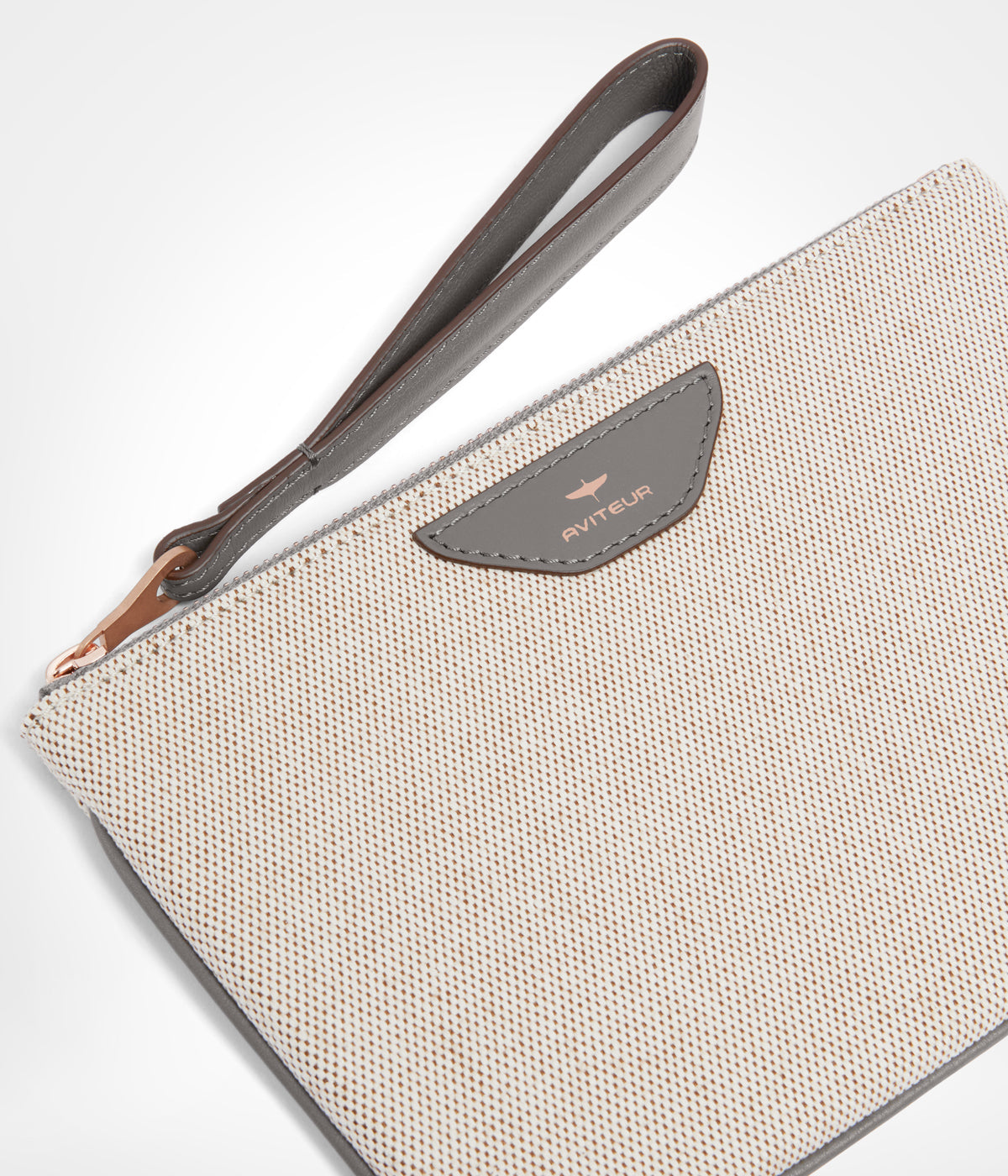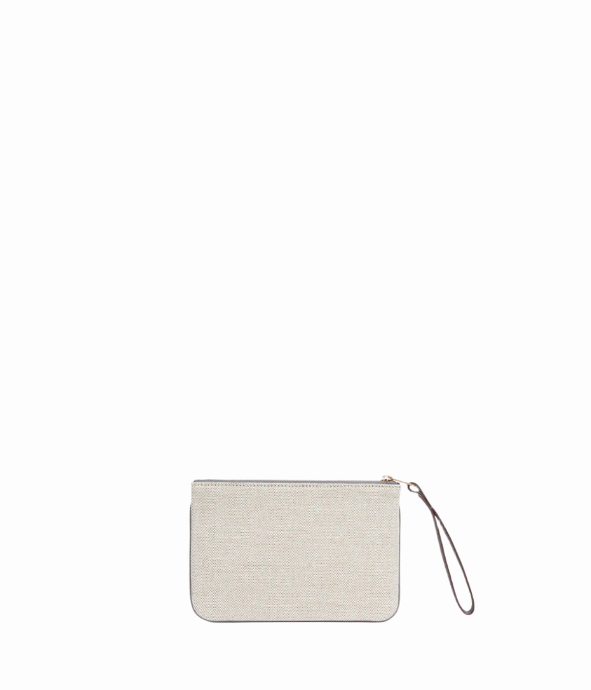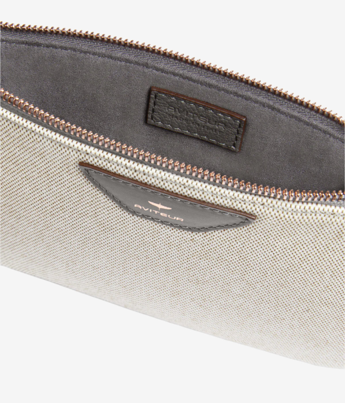 Pouch in canvas with leather trim, suitable for suitable for make-up, valuables and loose items. Inside pocket, zip in anodised rose gold.