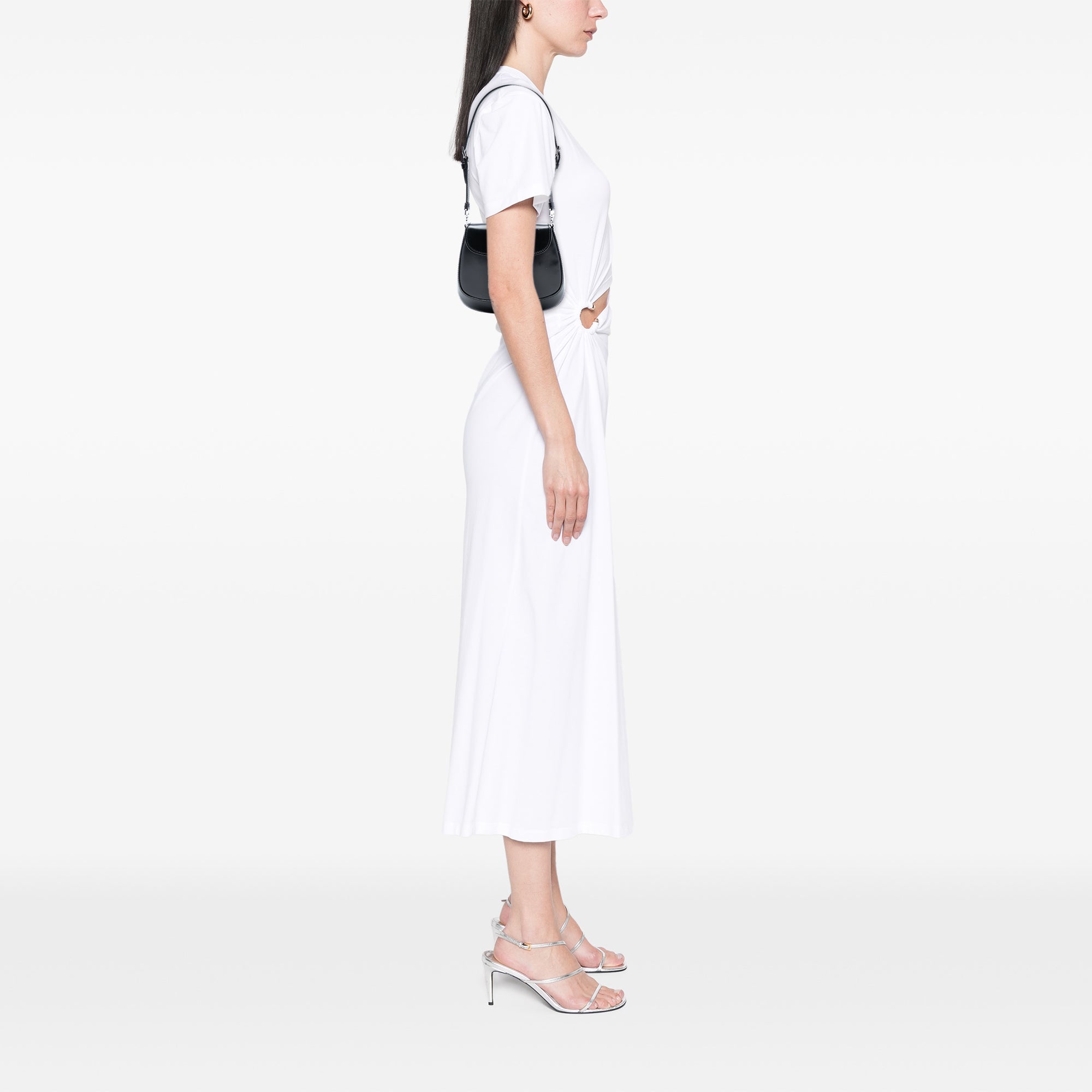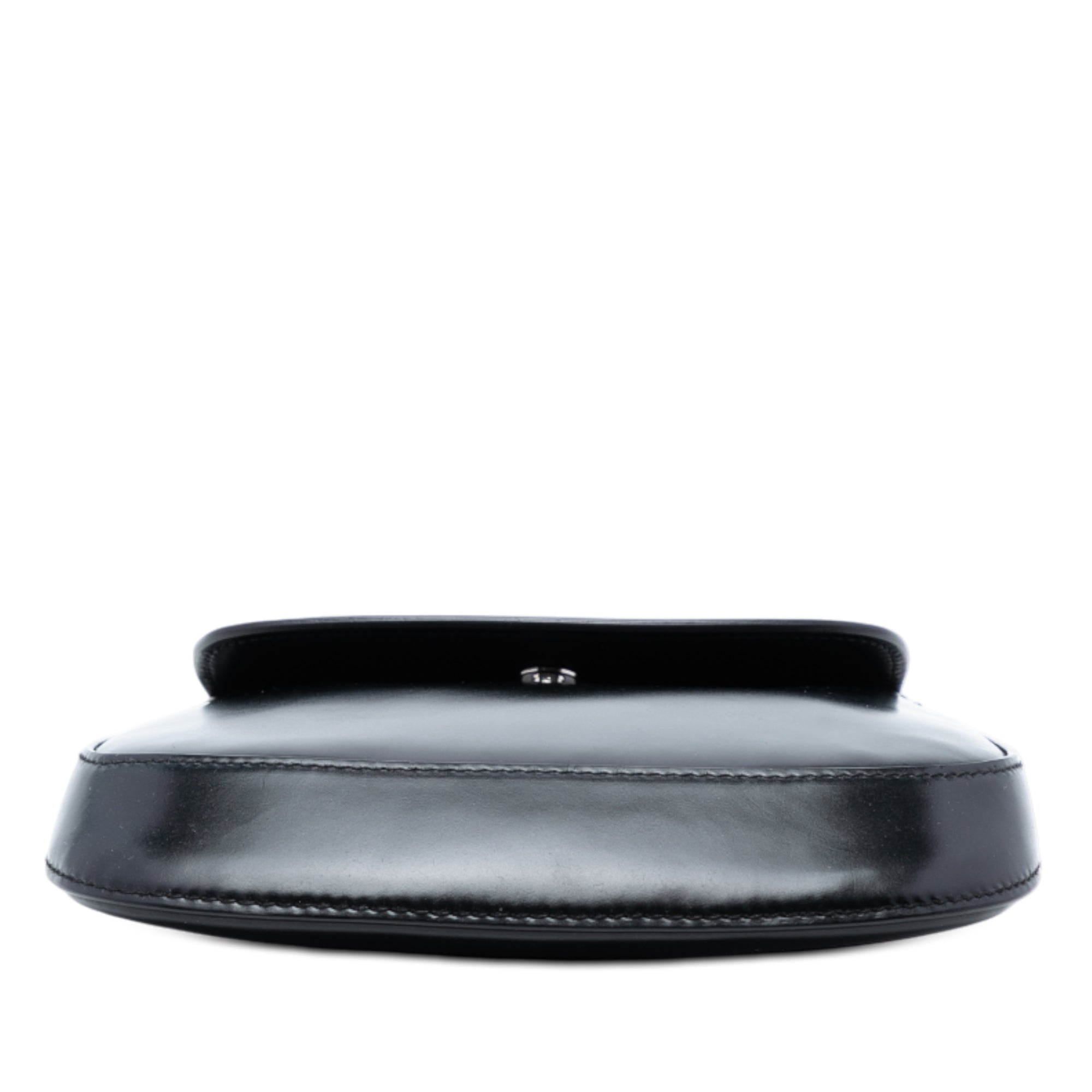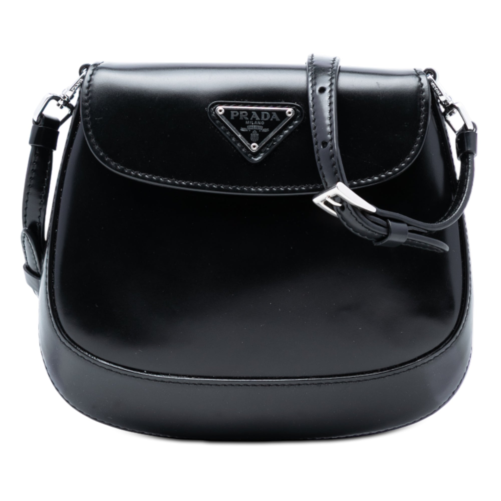 The Cleo crossbody bag features a patent leather body, an adjustable flat leather strap, a front flap with magnetic snap closure, and interior card slots.