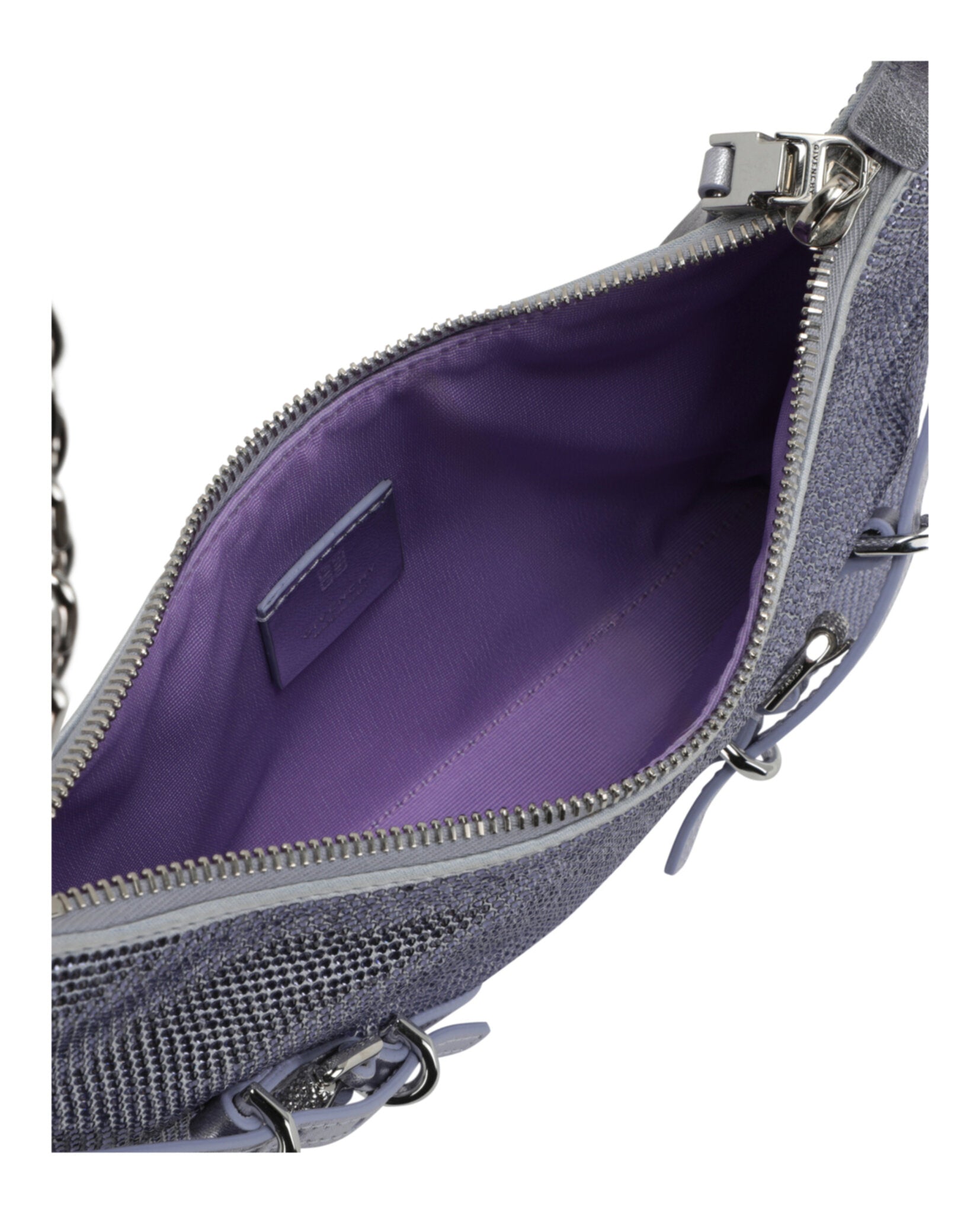 Elevate your evening ensemble with the Mini Voyou Party Shoulder Bag from Givenchy. This exquisite accessory features luxurious satin construction adorned with allover crystal embellishments that catch the light beautifully with every movement. The compact silhouette is accented with signature silver-tone buckle details and an adjustable shoulder strap bearing the iconic Givenchy name. Crafted from 100% lambskin leather in Italy, this sophisticated piece offers a secure top zipper closure to keep your essentials safe. Perfect for cocktail parties, evening events, or any special occasion where you want to make a glamorous statement.