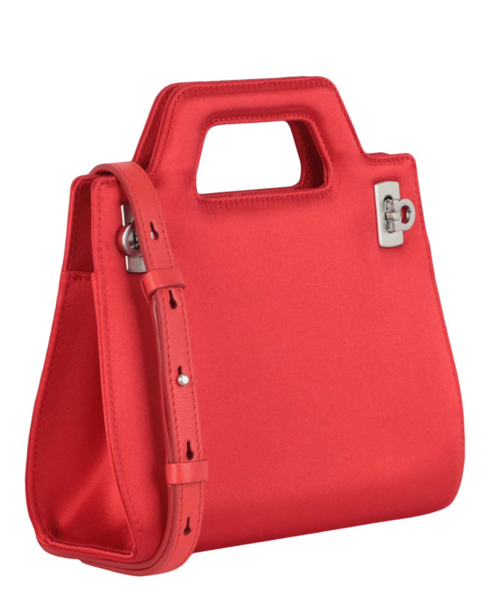 Introducing the Mini Wanda Satin Top-Handle Bag by Ferragamo, a luxurious accessory that seamlessly blends Italian craftsmanship with contemporary elegance. This exquisitely structured mini bag features a lustrous satin finish in 100% calfskin leather, complemented by signature Gancini closures and sophisticated silver-tone hardware.