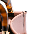 The Sunshine Shopper Tote features an embossed leather body, rolled acrylic top handles, a detachable flat leather shoulder strap, and an open top.