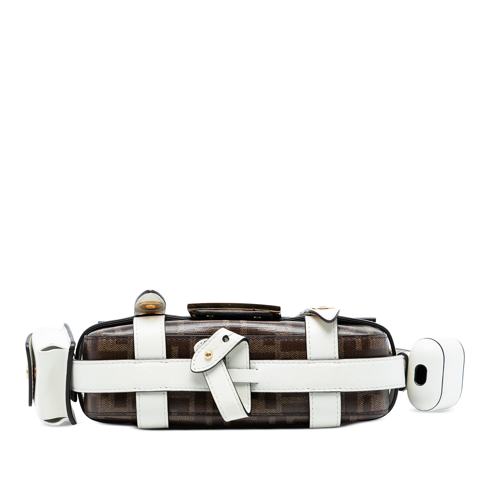 This satchel features a coated canvas body with leather trim, a removable flat coated canvas handle, a flat leather shoulder strap, a detachable curb chain strap, a front flap with magnetic snap closure, a detachable exterior flap pouch, and an interior slip pocket.