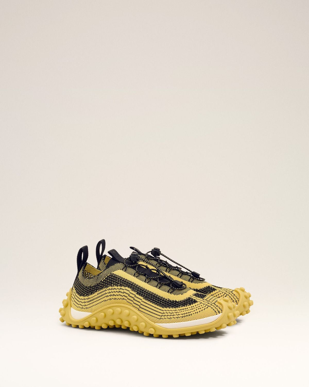 These eye-catching low-top sneakers feature a striking yellow and black colorway with a distinctive chunky sole that delivers both comfort and modern edge. The mixed-material construction showcases AMI's commitment to quality craftsmanship and innovative design.