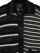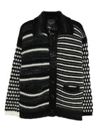 The classic shirt collar and button-front closure offer versatile styling options, while the expert knit construction ensures both warmth and breathability. The contrasting black and white mixed stitch patterns make this cardigan-style shirt a statement piece that effortlessly transitions from casual weekend wear to smart-casual occasions.
