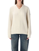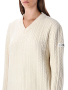 THIS MM6 MAISON MARGIELA SWEATER COMBINES TIMELESS ELEGANCE WITH CONTEMPORARY EASE. CRAFTED IN A SOFT WOOL BLEND, IT FEATURES A VERTICAL CABLE KNIT TEXTURE, A FLATTERING V-NECKLINE, AND A RELAXED FIT FOR VERSATILE WEAR.