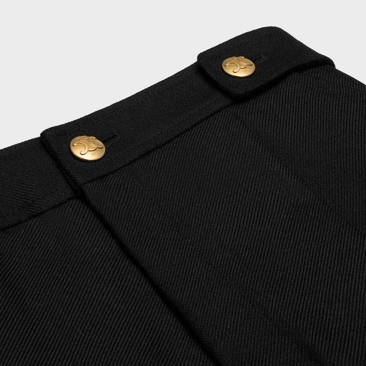 Featuring a sophisticated wide-leg silhouette with elegant pleating and distinctive gold button detailing at the waist, these black pants epitomize timeless elegance and modern refinement.