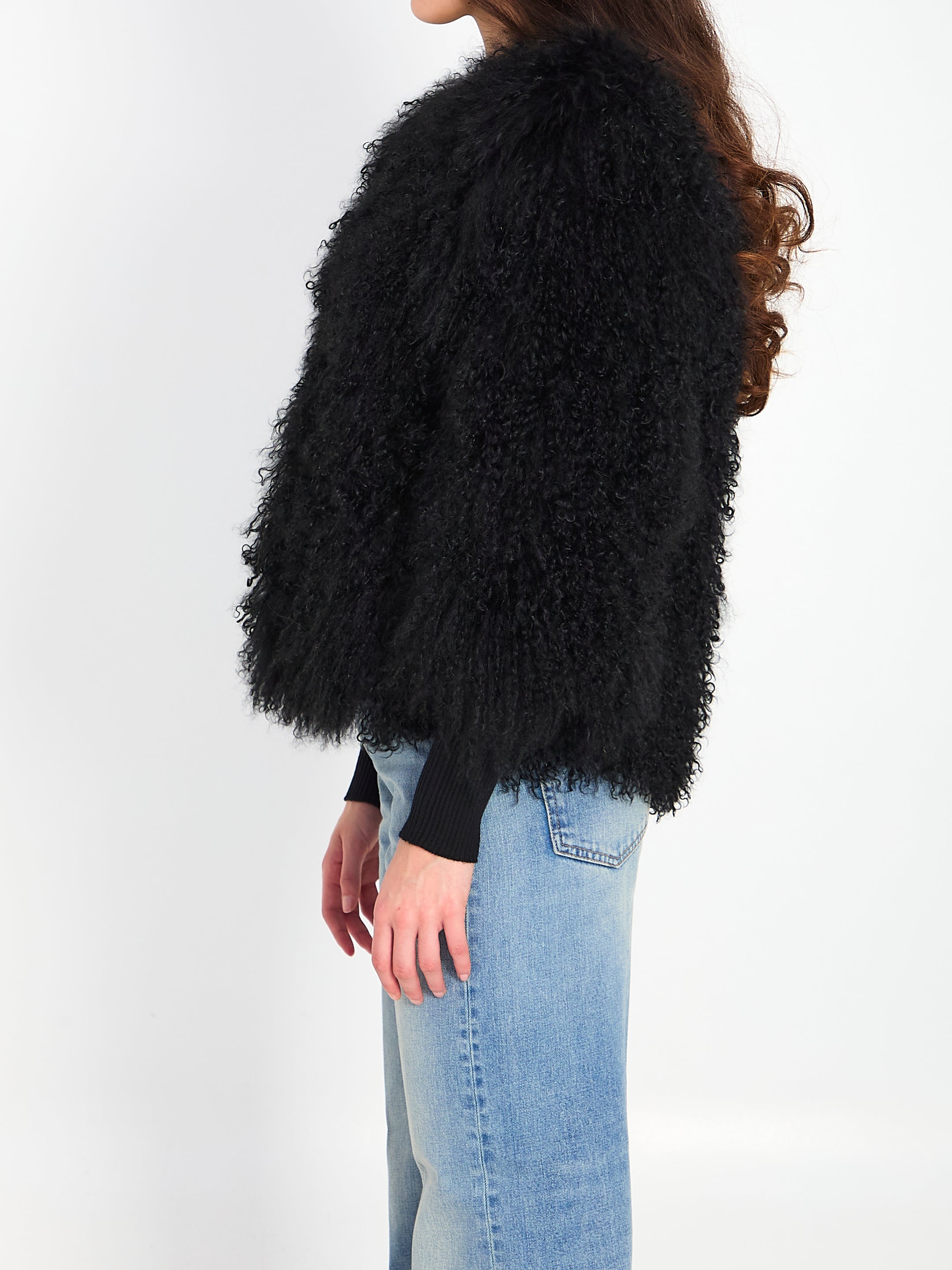 Jacket in long-haired black-dyed real Mongolian lamb fur. Features a front hook closure, two side pockets, and a silk lining. Regular fit.