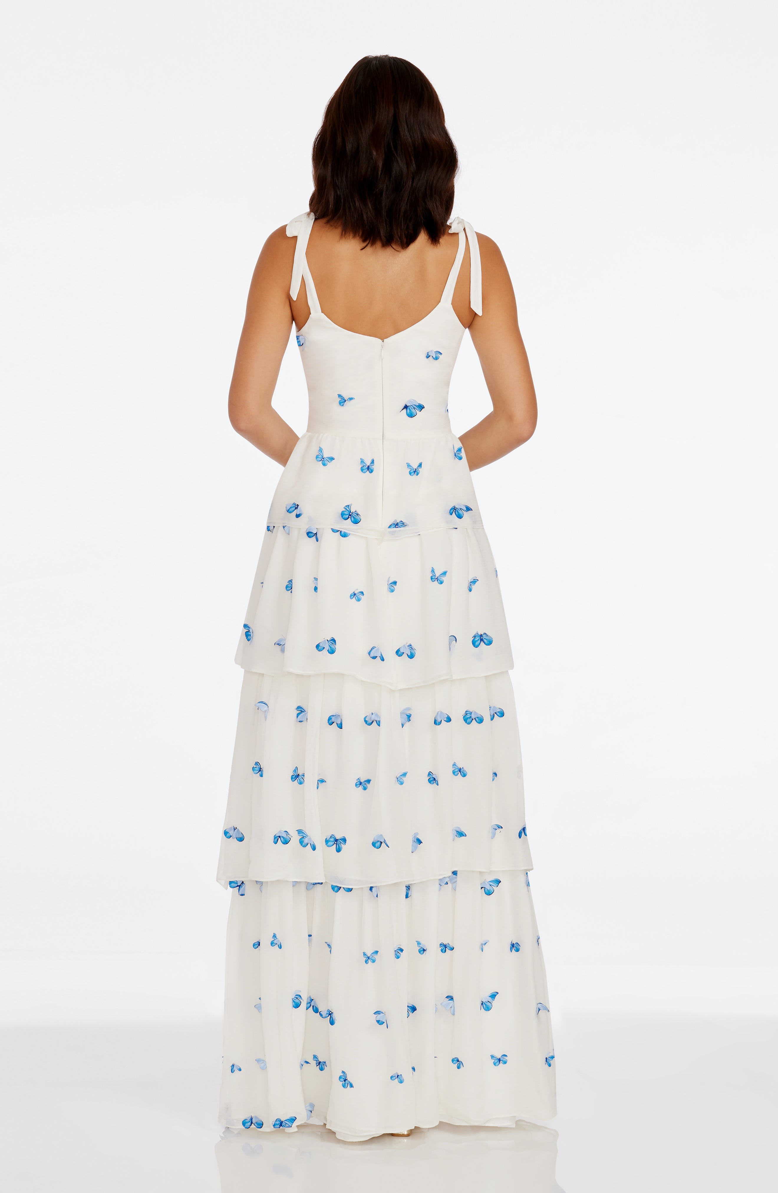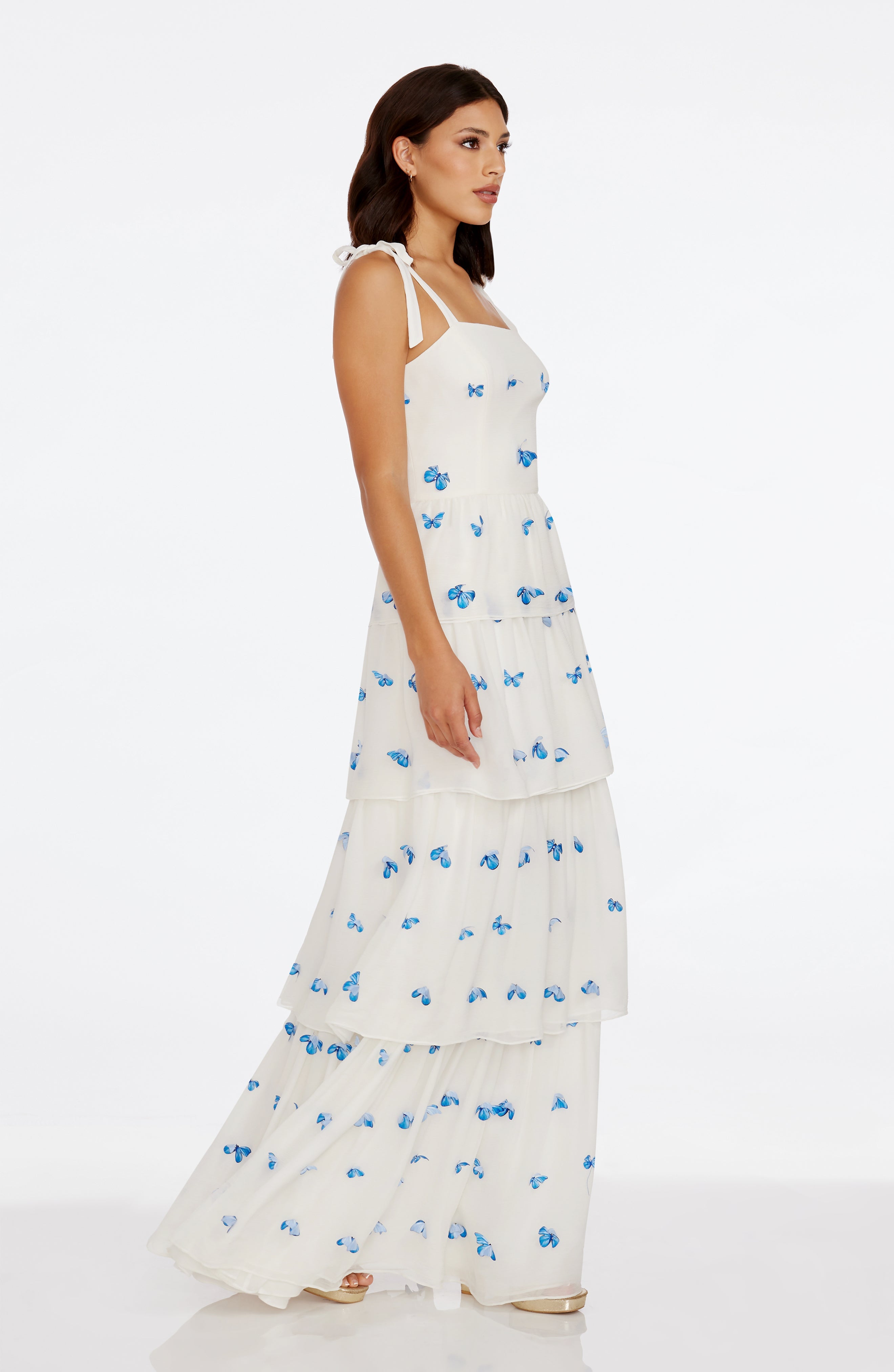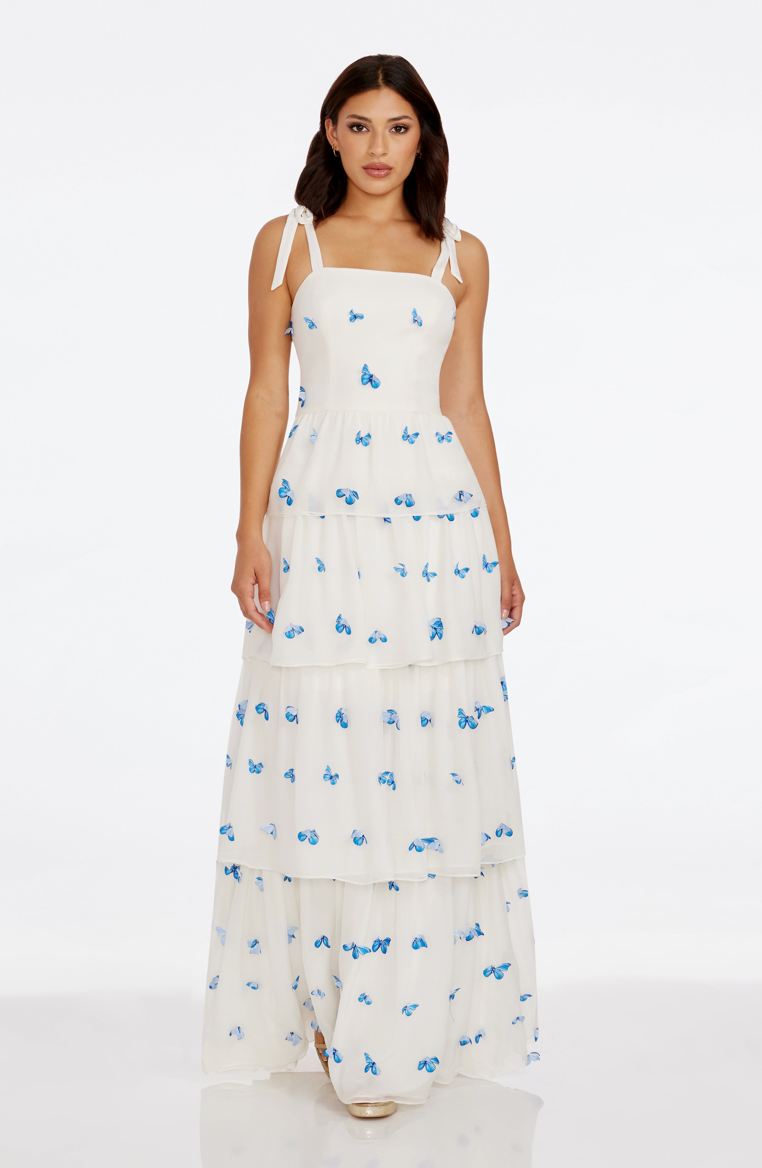 The Monica Dress features a square neckline and tiered design with tie straps for a stylish and elegant look.