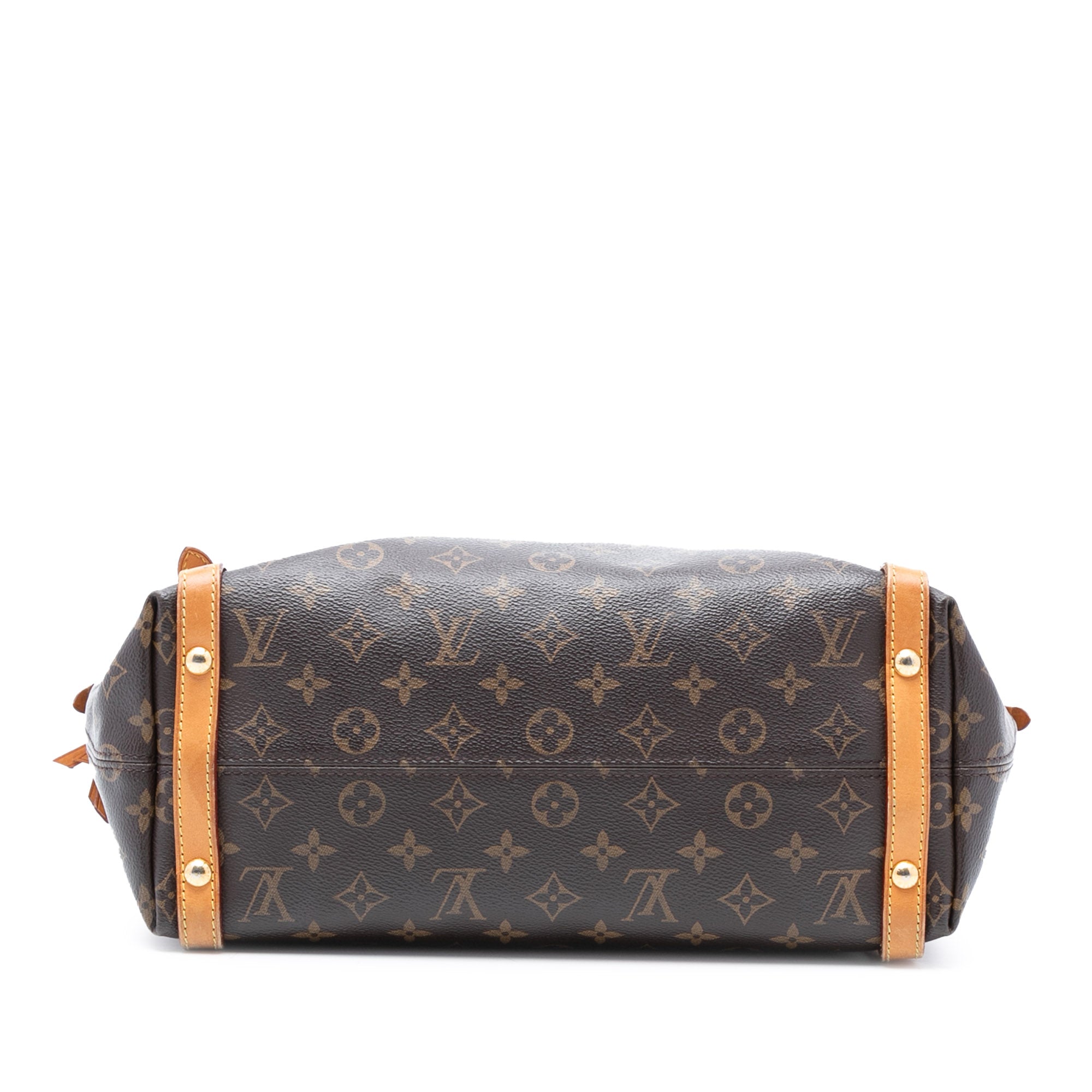 The Tuileries features a monogram canvas body with vachetta leather trim, adjustable flat vachetta leather handles, a top zip closure, and interior slip pockets.