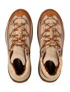 CRAFTED IN WARM BROWN AND BEIGE TONES, THEY FEATURE CRISS-CROSS TUBULAR LACES, METAL EYELETS, AND A DRAWSTRING TOP FOR AN ADJUSTABLE FIT.