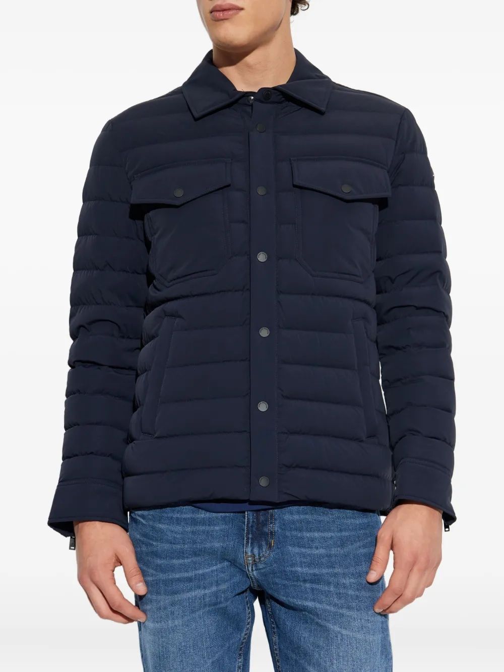 Elevate your cold-weather wardrobe with the Moose Knuckles Buttoned Down Jacket, a sophisticated take on classic puffer styling. This navy quilted jacket features a unique button-front closure instead of the traditional zipper, creating a refined, shirt-inspired aesthetic that sets it apart from ordinary outerwear.