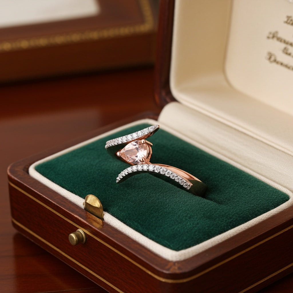 This pretty open wrap ring is crafted in 10-karat rose gold. This gorgeous ring features a pear-cut, prong-set morganite gemstone at the center and round-cut, prong-set dazzling diamonds embellished in a unique pattern. Enhanced with a high polished finish, this modern gemstone and diamond ring is the perfect gift for your beloved. A stunning addition to any jewelry collection.