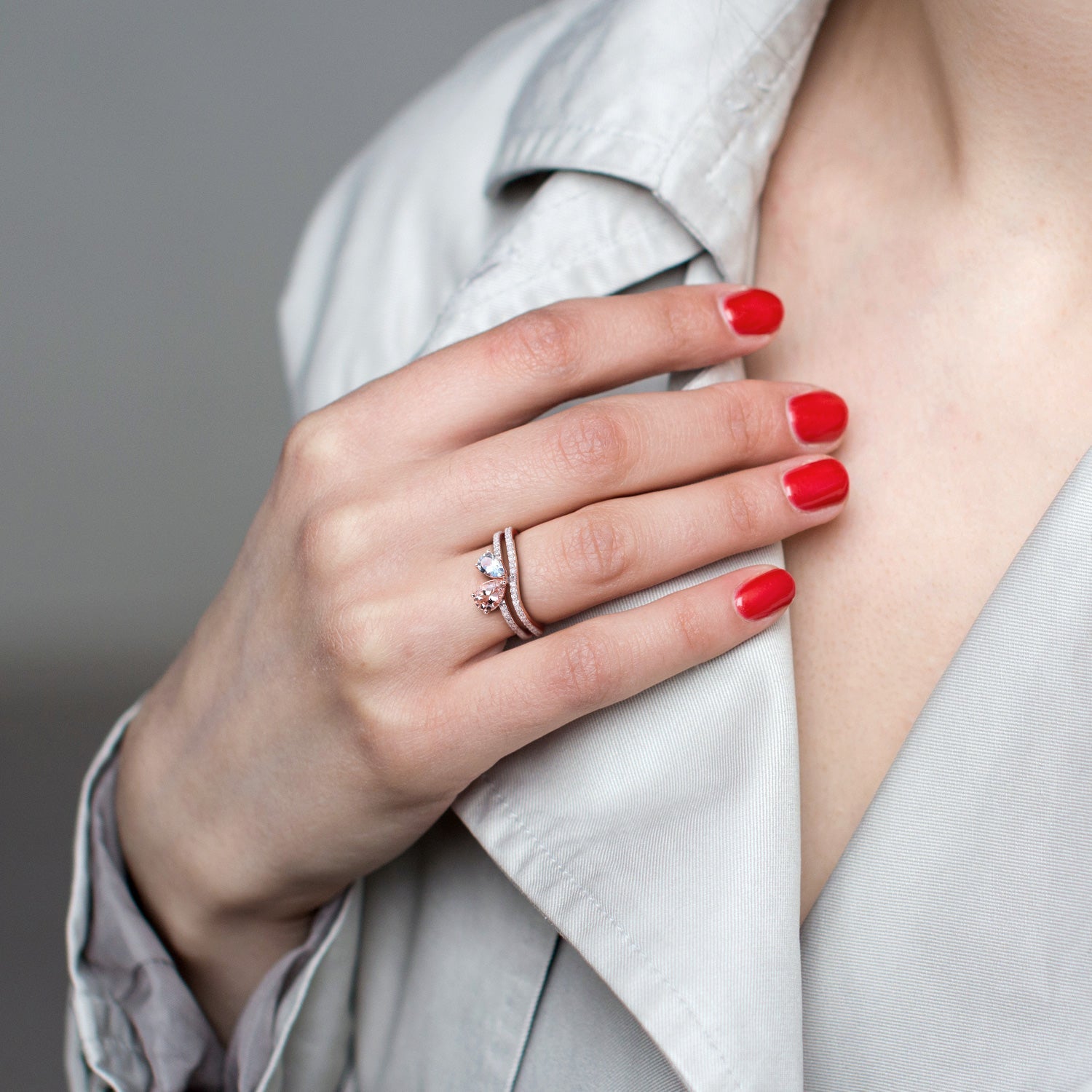 This pretty pear-cut two-stone open ring is crafted in 10-karat rose gold. This stunning ring features a pear-cut, prong-set aquamarine and a morganite gemstones at the center with round-cut, prong-set diamonds along the bands. Enhanced with a high polished finish, this modern gemstone and diamond ring is the perfect gift for your beloved. A stunning addition to any jewelry collection.