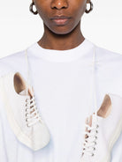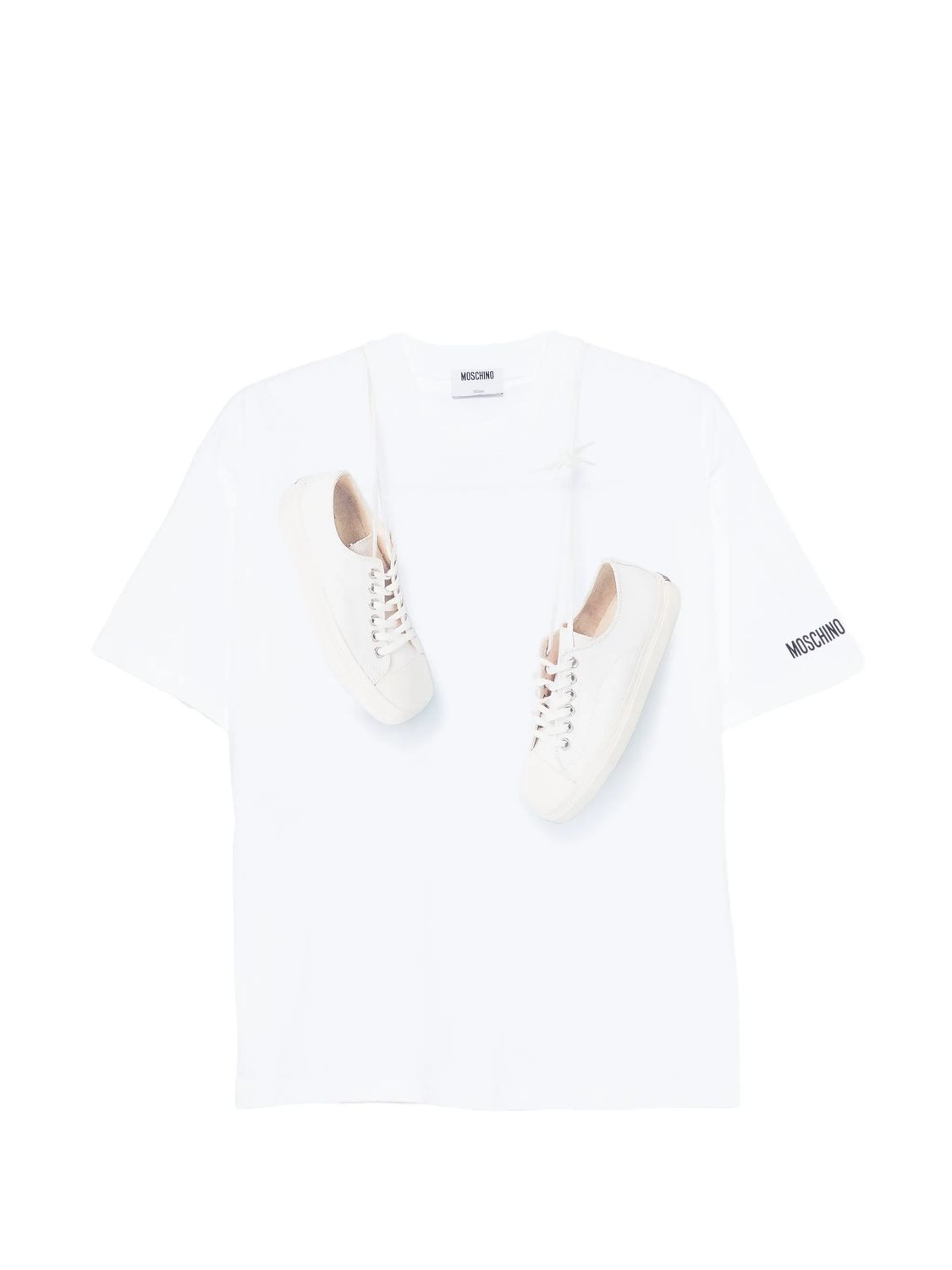 Make a statement with this playful short-sleeve t-shirt from MOSCHINO COUTURE. Featuring a bold graphic print of white sneakers across the front and signature branding on the sleeve, this crew neck tee brings the brand's signature wit and irreverence to your everyday wardrobe.