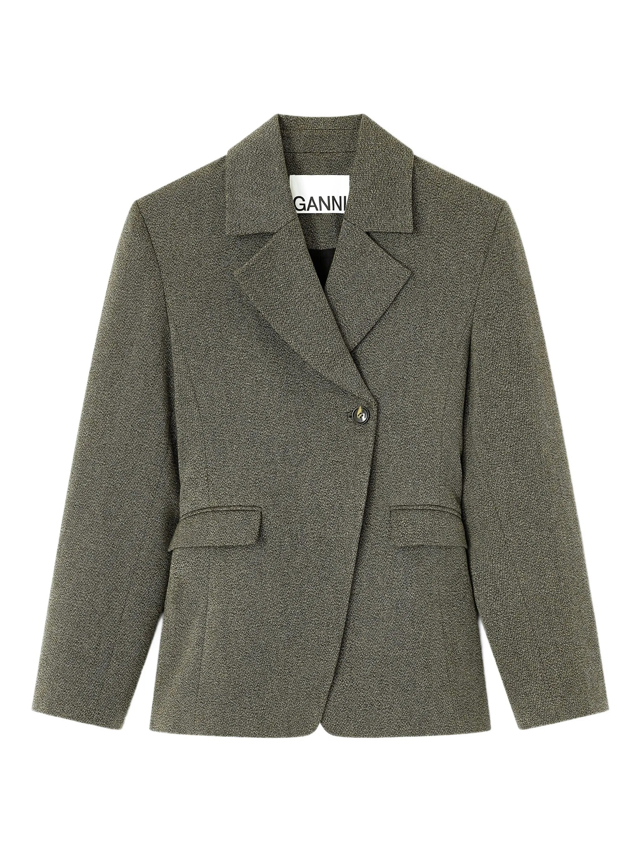 Crafted from a sustainable blend of 58% organic cotton, 25% recycled wool, and recycled polyester and polyamide, this blazer reflects Ganni's commitment to responsible fashion without compromising on style or quality.