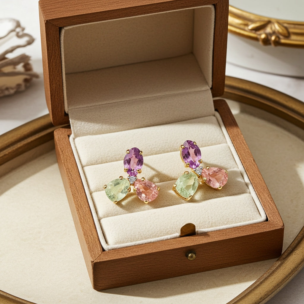 These unique 3-stone stud earrings fit your wardrobe seamlessly. This pair is crafted in lustrous 14k yellow gold and features two round-cut diamonds in the center surrounded by fancy-cut green sapphire, pink sapphire and purple sapphire gemstones in a 3-stone pattern. Polished to a brilliant shine, these are secured with butterfly clasps. These are the perfect fit for days when your look needs an extra pop of color.