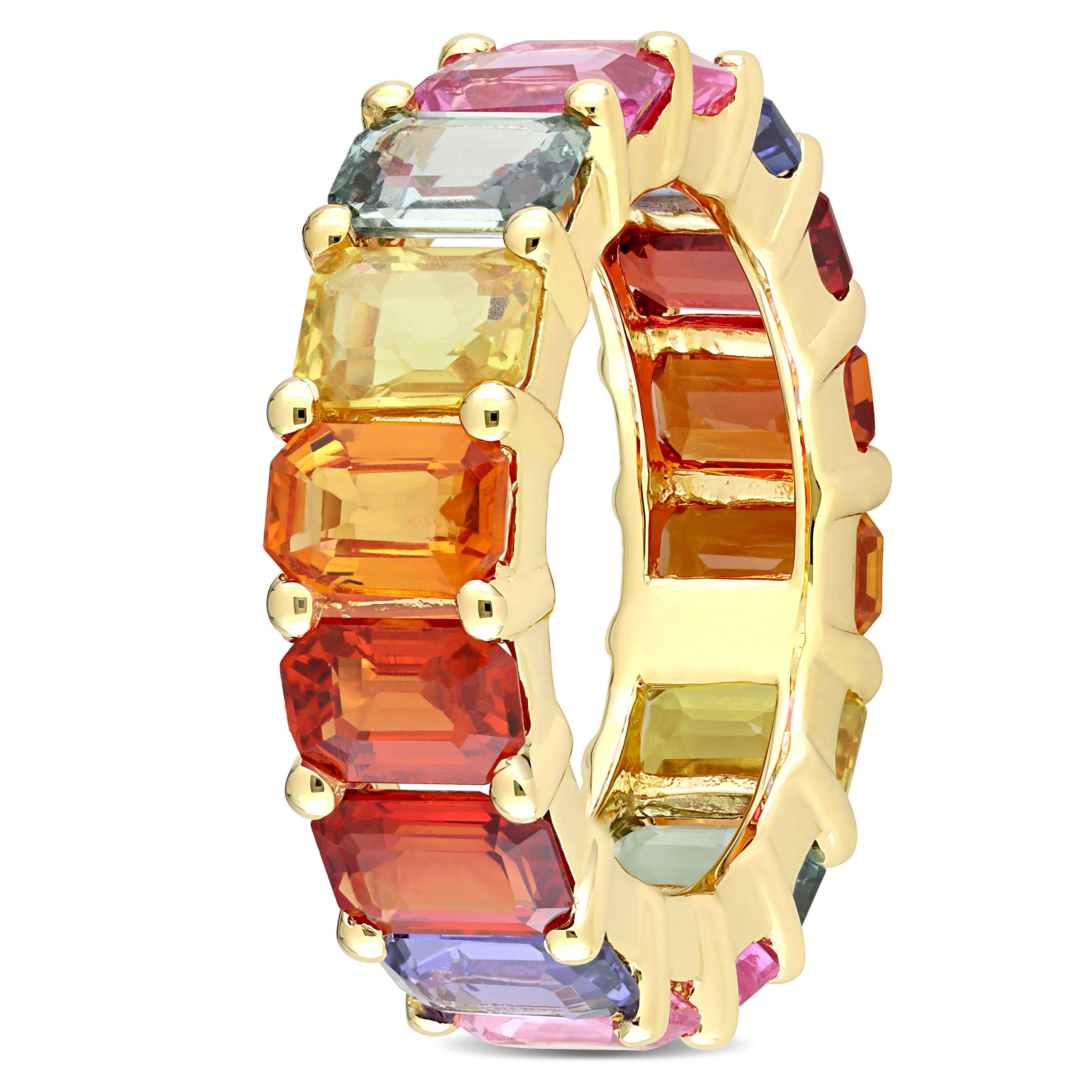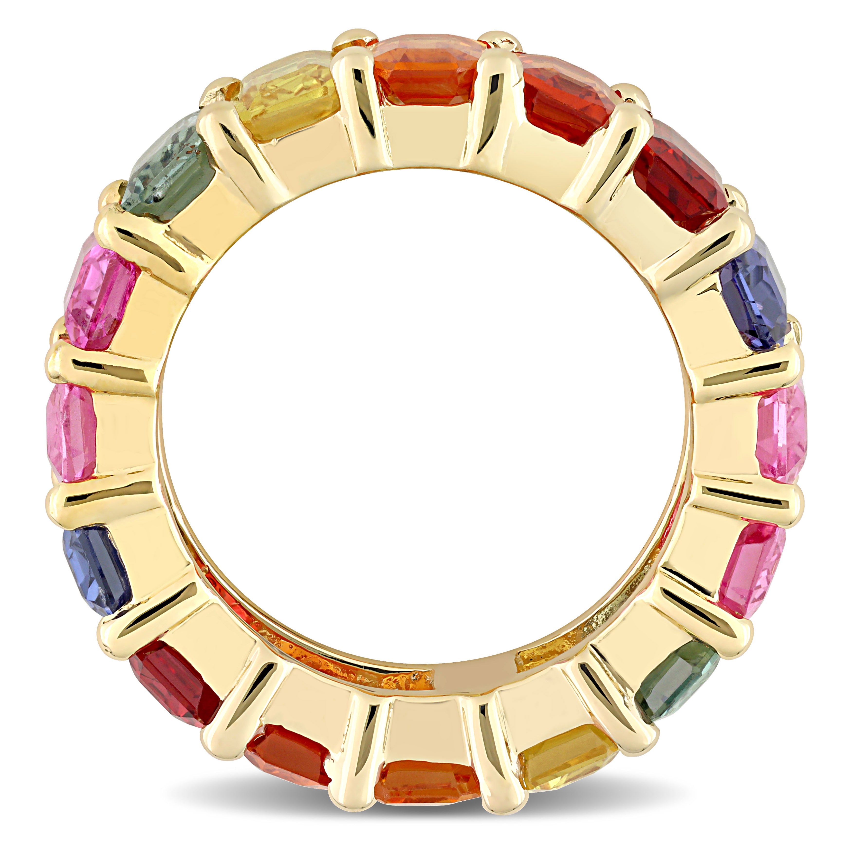 This vibrant colored sapphire eternity ring is crafted in 14-karat yellow gold and features octagon-cut, prong-set multi-color sapphires all along the band. Enhanced with a high polish finish, this eye-catching eternity band is sure to add a burst of color and class to any occasion. A modern take on the classic anniversary band design, this exquisite rainbow gemstone ring is sure to make a standout addition to any jewelry collection.