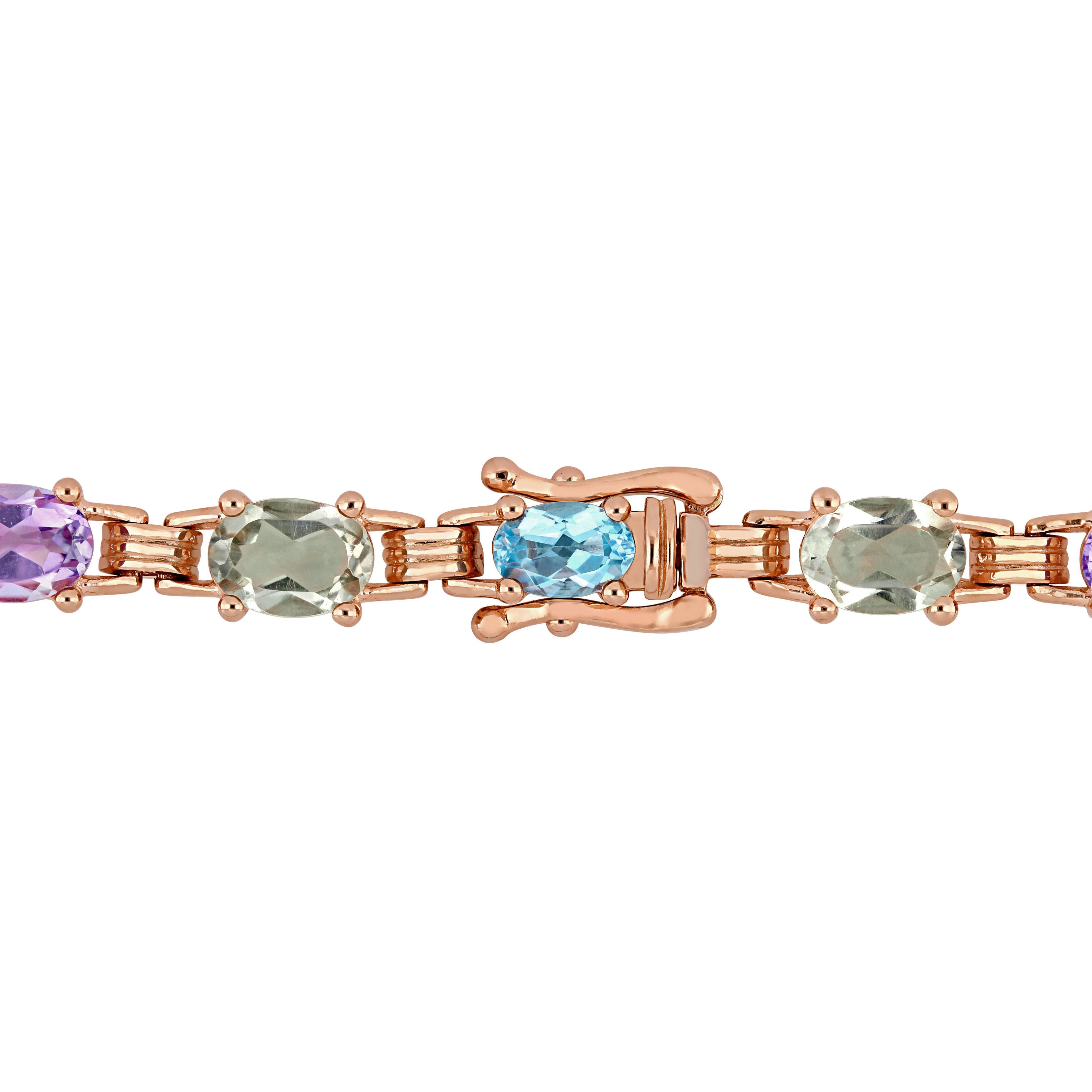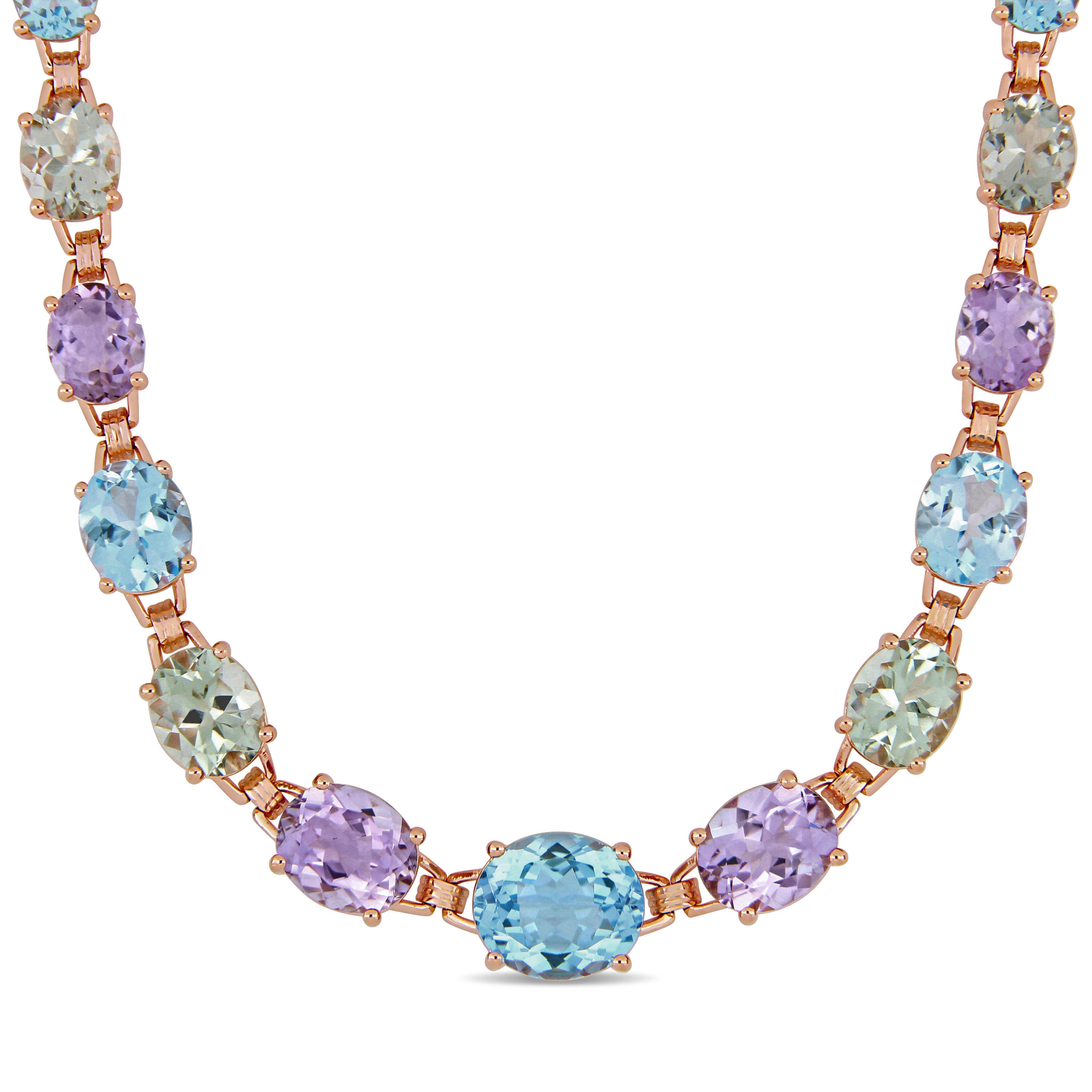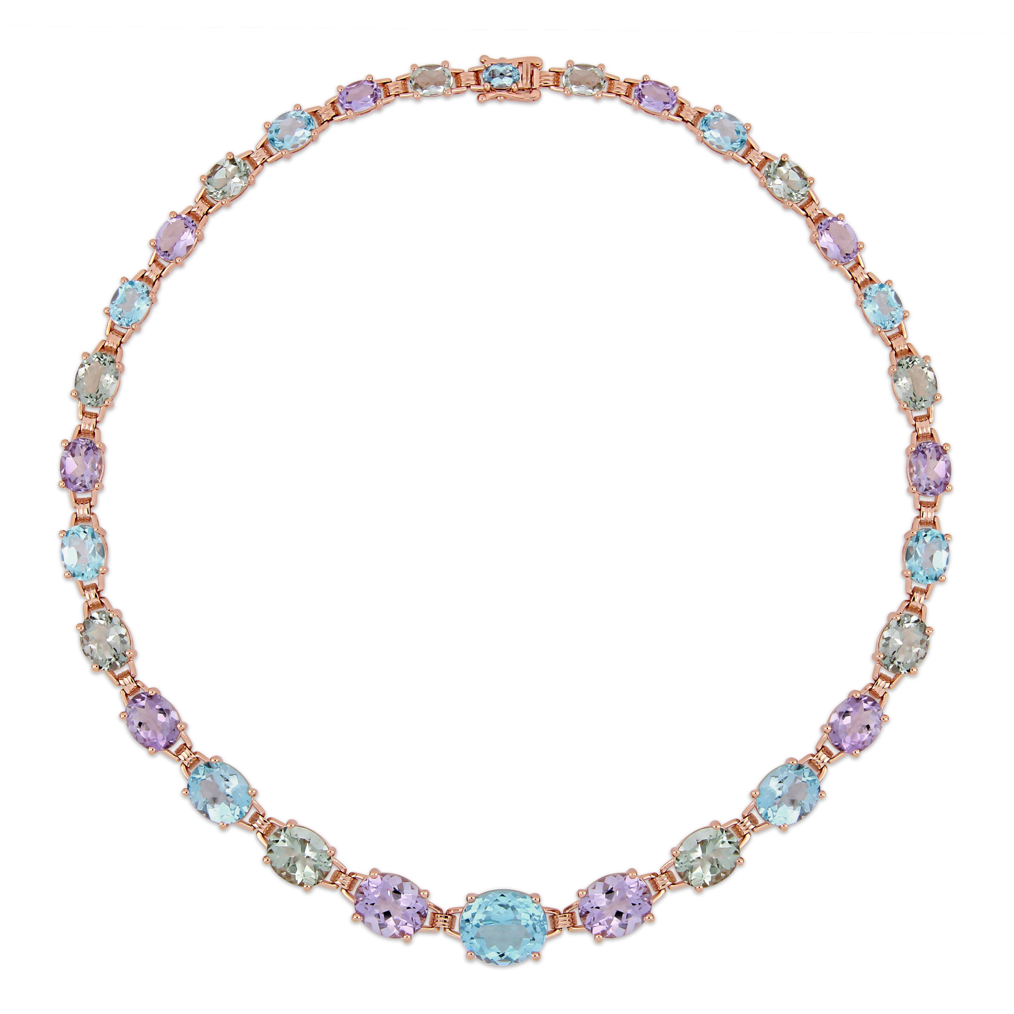 This bold multi-gemstone link necklace is crafted in rose-plated sterling silver and showcases oval-cut, prong-set green quartz, blue topaz and Rose de France gemstones placed together in a ravishing link design. Instantly elevate any ensemble with this colorful and shimmering gemstone necklace. A perfect choice for today's contemporary woman with a unique and trendsetting sense of style. Choose this exquisite piece either for yourself or someone you love.