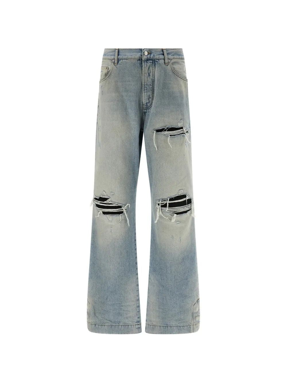 Elevate your denim collection with the MX1 Straight Flare Jean from AMIRI, a signature piece that embodies the brand's rock-and-roll aesthetic. These light-wash jeans feature the iconic MX1 construction with strategically placed distressing at the thigh and knee, revealing contrasting black fabric patches underneath for an edgy, dimensional look.