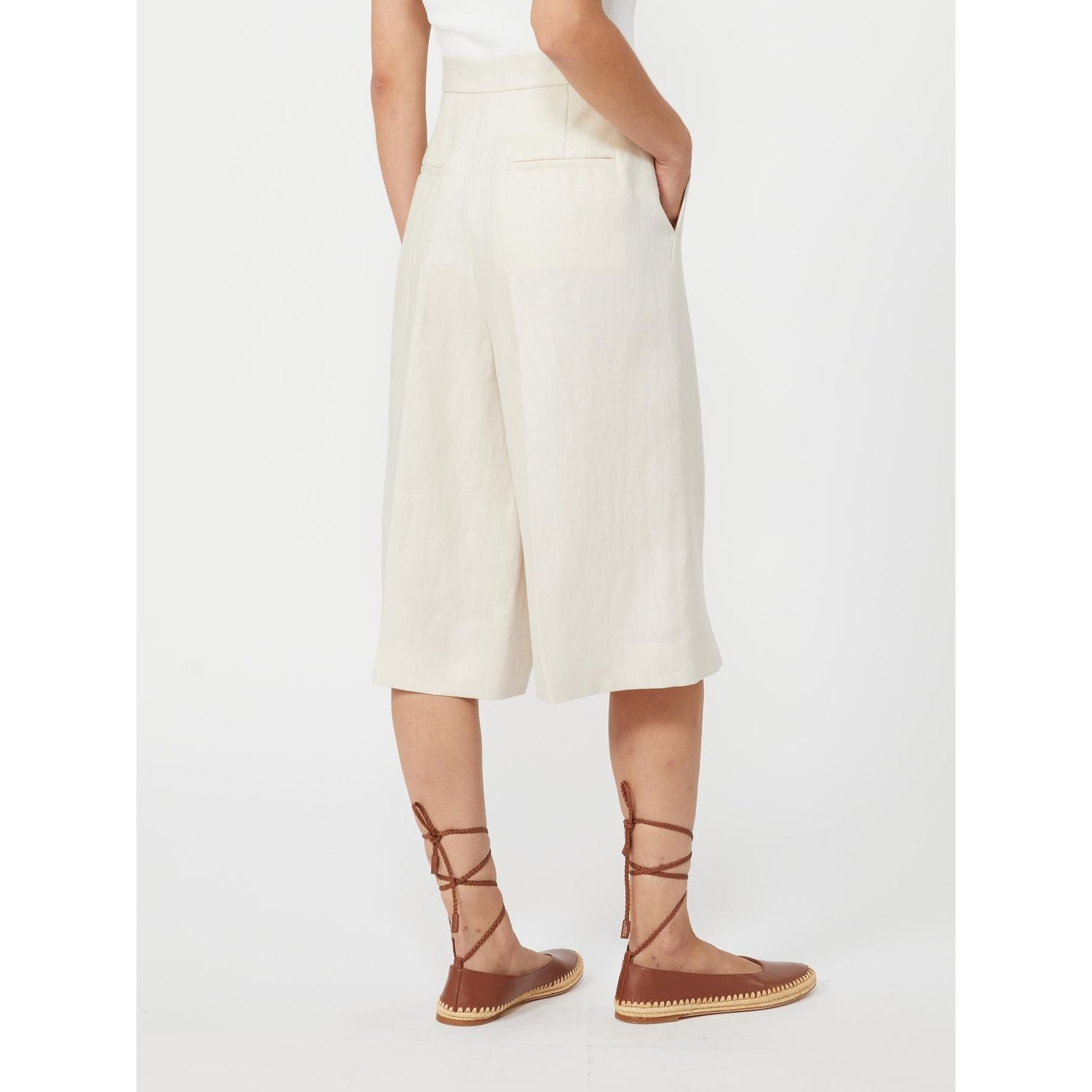 These impeccably tailored pants feature a flattering high-rise silhouette with a center front pleat detail that creates elegant vertical lines. The cropped length hits perfectly below the knee, making them ideal for showcasing your favorite footwear while maintaining a polished, refined aesthetic.