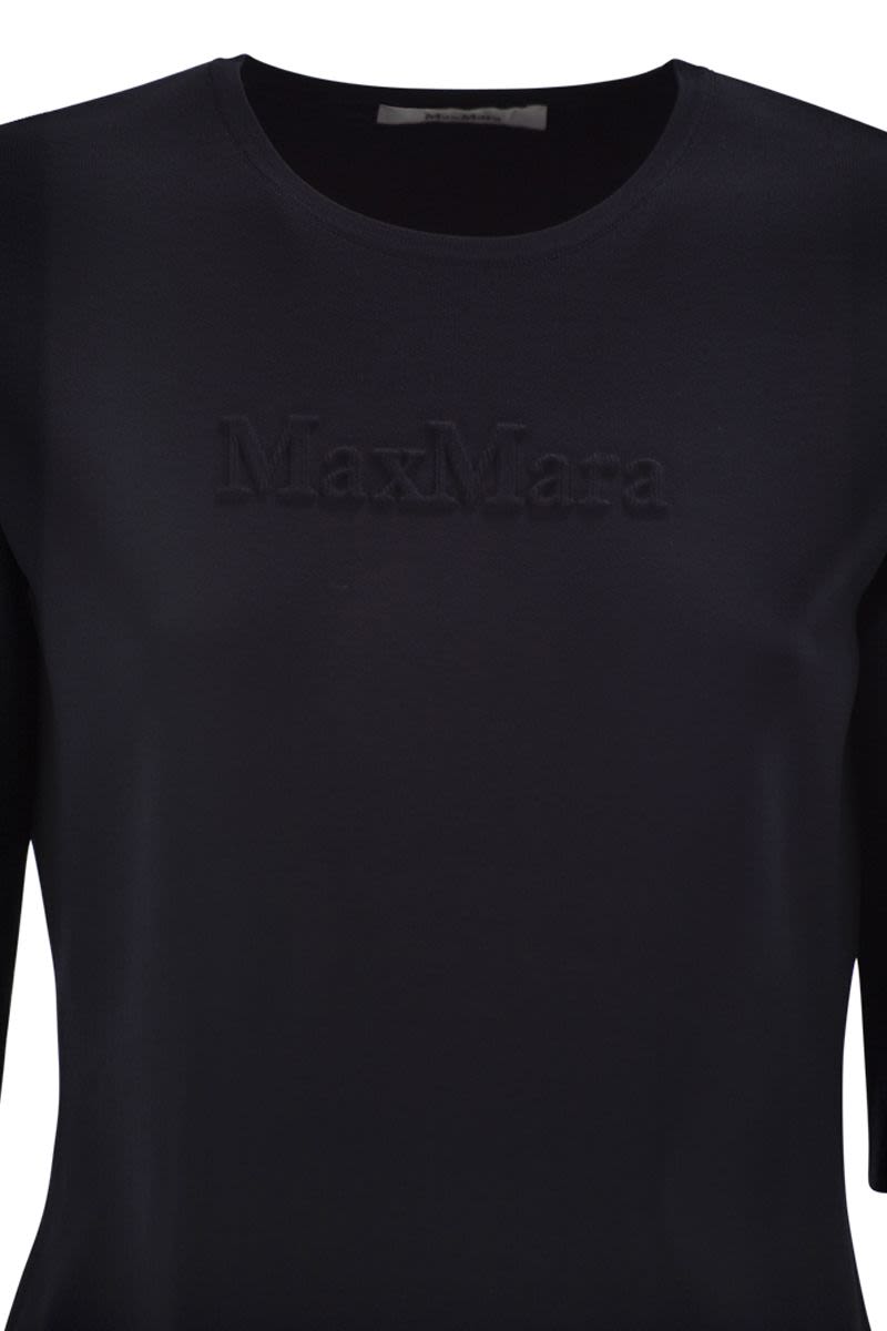 MAX MARA TOP IN COMPACT VISCOSE AND POLYAMIDE JERSEY, A FLUID AND COMFORTABLE FABRIC THAT GUARANTEES A FLAWLESS FIT AND A PLEASANT FEEL AGAINST THE SKIN. THE MODEL FEATURES A ROUND NECKLINE AND SHORT SLEEVES, WITH A SIMPLE SILHOUETTE THAT NATURALLY ENHANCES THE FIGURE. THE TONE-ON-TONE MAX MARA LOGO EMBROIDERED ON THE CHEST ADDS A DISCREET YET DISTINCTIVE DETAIL, EXPRESSING THE BRAND'S UNDERSTATED ELEGANCE. VERSATILE AND CONTEMPORARY, THIS TOP PAIRS EASILY WITH TAILORED BLAZERS, FLOWING TROUSERS OR DENIM, ADAPTING EFFORTLESSLY TO EVERYDAY AND MORE REFINED LOOKS. - ROUND NECKLINE - SHORT SLEEVES - TONE-ON-TONE EMBROIDERED MAX MARA LOGO ON THE FRONT - STRAIGHT LINE - REGULAR FIT DESIGNER ID: 2611361098600 004