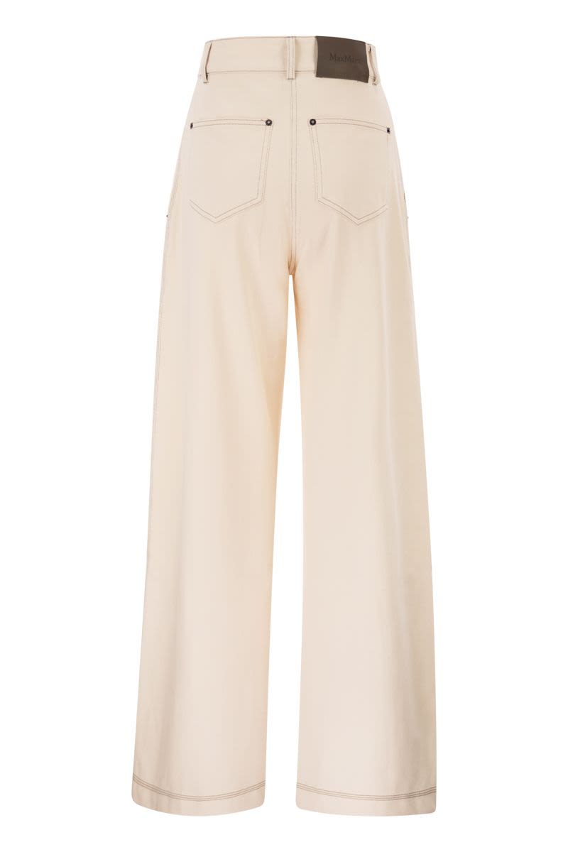 WIDE-LEG JERSEY TROUSERS IN A COTTON BLEND WITH A DENIM EFFECT, FEATURING ICONIC DENIM-STYLE DETAILS: VINTAGE-EFFECT GALVANISED METAL RIVETS AND LEATHER-COLOURED STITCHING. - WIDE LEG FLARED AT THE BOTTOM AND SLIGHTLY LOW CROTCH - COVERED ZIP FASTENING AND LOGO STUD BUTTON - SIDE POCKETS AND SHAPED PATCH POCKETS ON THE BACK - PLEATS WITH IRONED CREASE ON THE FRONT, SHIFTED TOWARDS THE SIDE - LEATHER LOGO LABEL AT THE BACK OF THE WAIST - BELT LOOPS AT THE WAIST DESIGNER ID: 2611781108600 001