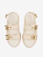 These cream-colored platform sandals feature a distinctive chunky ridged sole that adds both height and comfort, while three adjustable buckle straps with luxe gold hardware ensure a secure and customizable fit. The open-toe design makes them ideal for warm-weather styling.