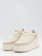 NAMA WEDGE SNEAKERS IN SMOOTH AND SUEDE CALFSKIN IN “TAN ROSE” COLOR. FEATURING HAND-STITCHED DETAILING, RIBBED WEDGE STRUCTURE, LACES, AND EMBOSSED CHLOé LOGO ON THE BACK. DUST BAG INCLUDED. ANY IRREGULARITIES IN THE LEATHER ARE NOT TO BE CONSIDERED DEFECTS, BUT RATHER A CHARACTERISTIC OF THE MATERIAL.