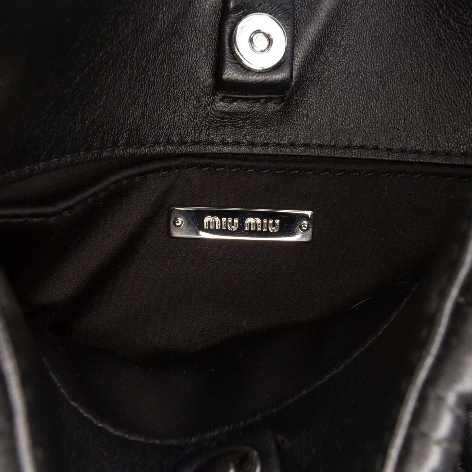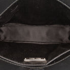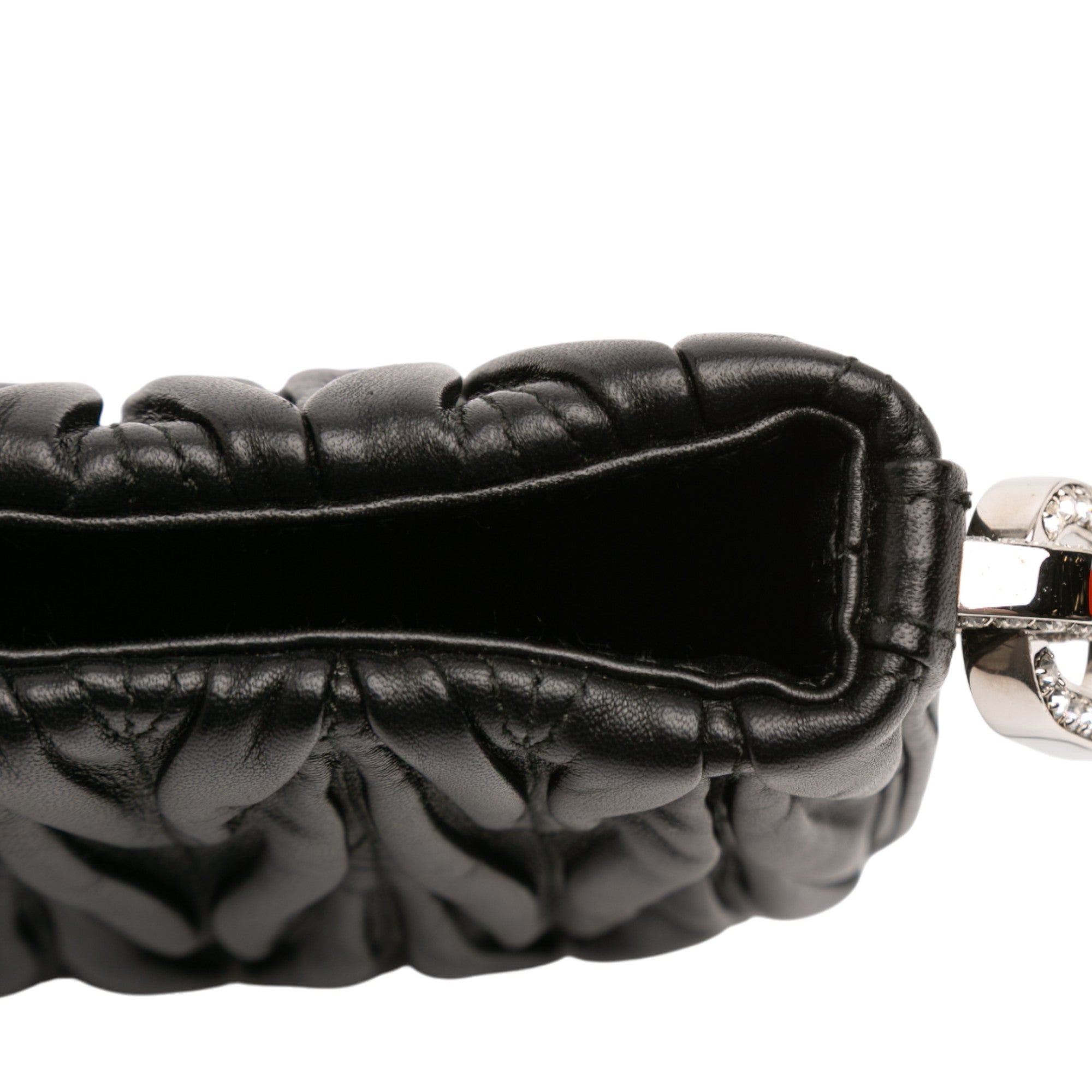 This shoulder bag features a quilted nappa leather body, a rolled meatal strap, an open top with magnetic snap closure, and an interior slip pocket.