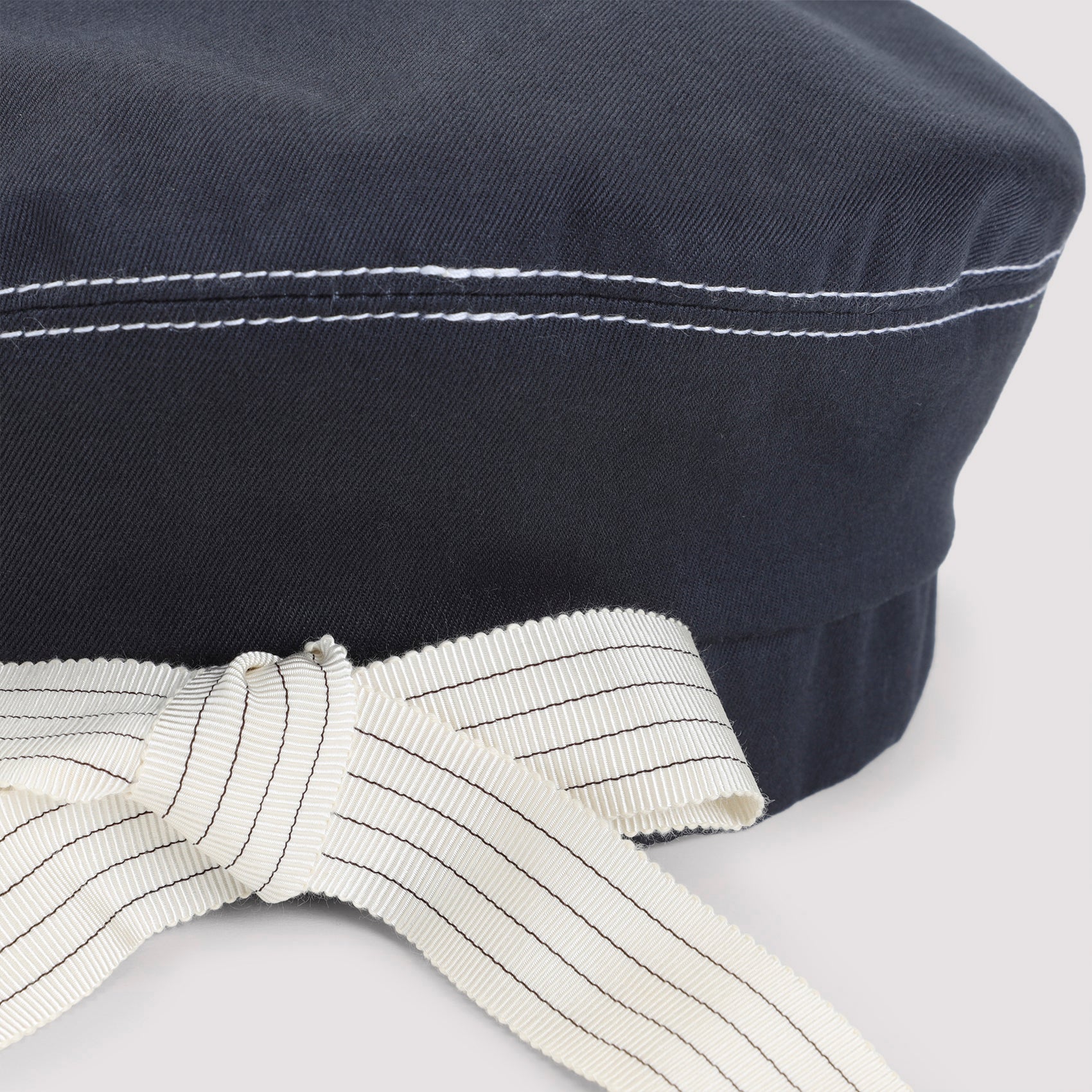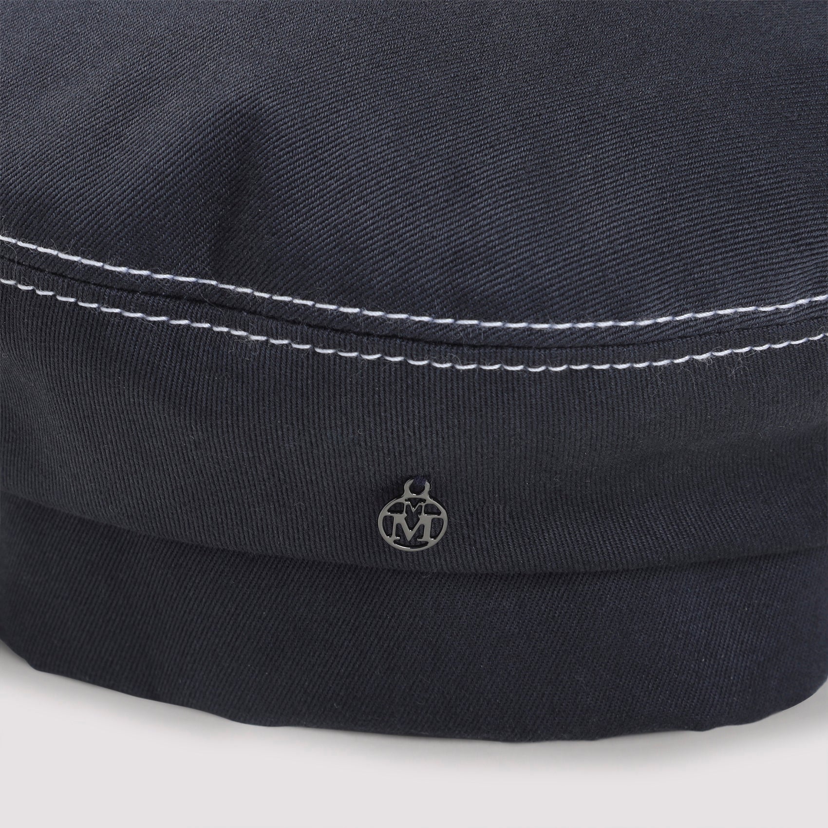 This classic beret design is expertly crafted from premium navy blue cotton and features distinctive contrasting white stitching that adds a refined nautical touch. The metal logo accent and elegant grosgrain bow at the back provide signature Maison Michel detailing.