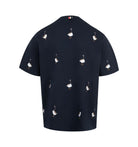 Elevate your casual wardrobe with this distinctive Navy Blue Geese T-Shirt from Thom Browne. Featuring the designer's signature whimsical touch, this premium tee showcases an all-over pattern of embroidered white geese against a rich navy backdrop, creating a playful yet sophisticated aesthetic.
