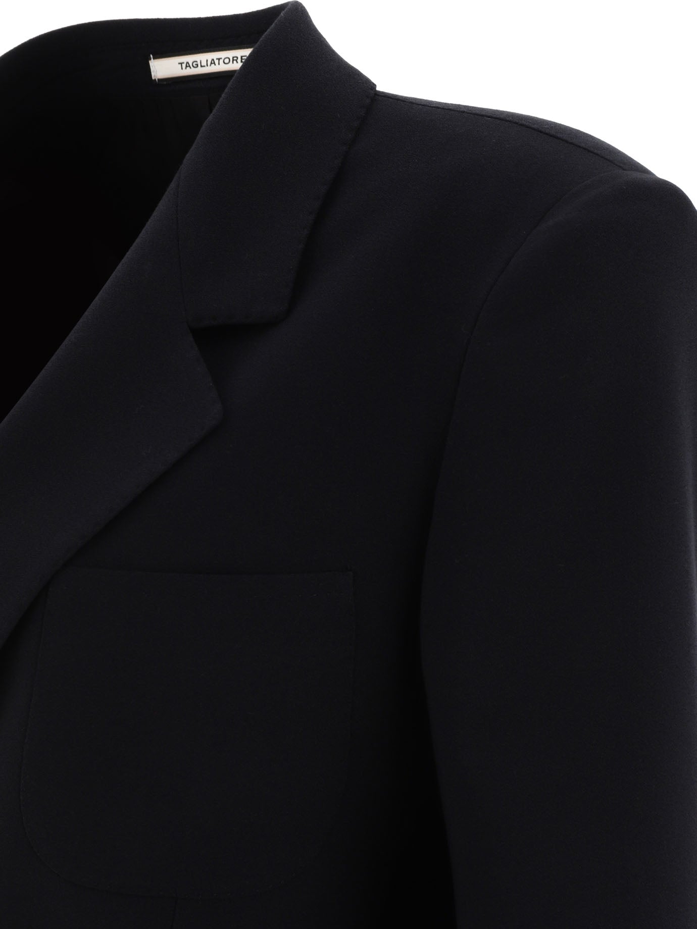 Elevate your professional wardrobe with the "Nayade" blazer by Tagliatore. This sophisticated double-breasted blazer features classic notch lapels and gleaming gold-tone buttons that add a touch of luxury to the timeless black silhouette.