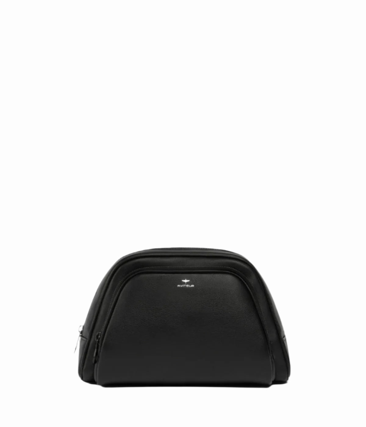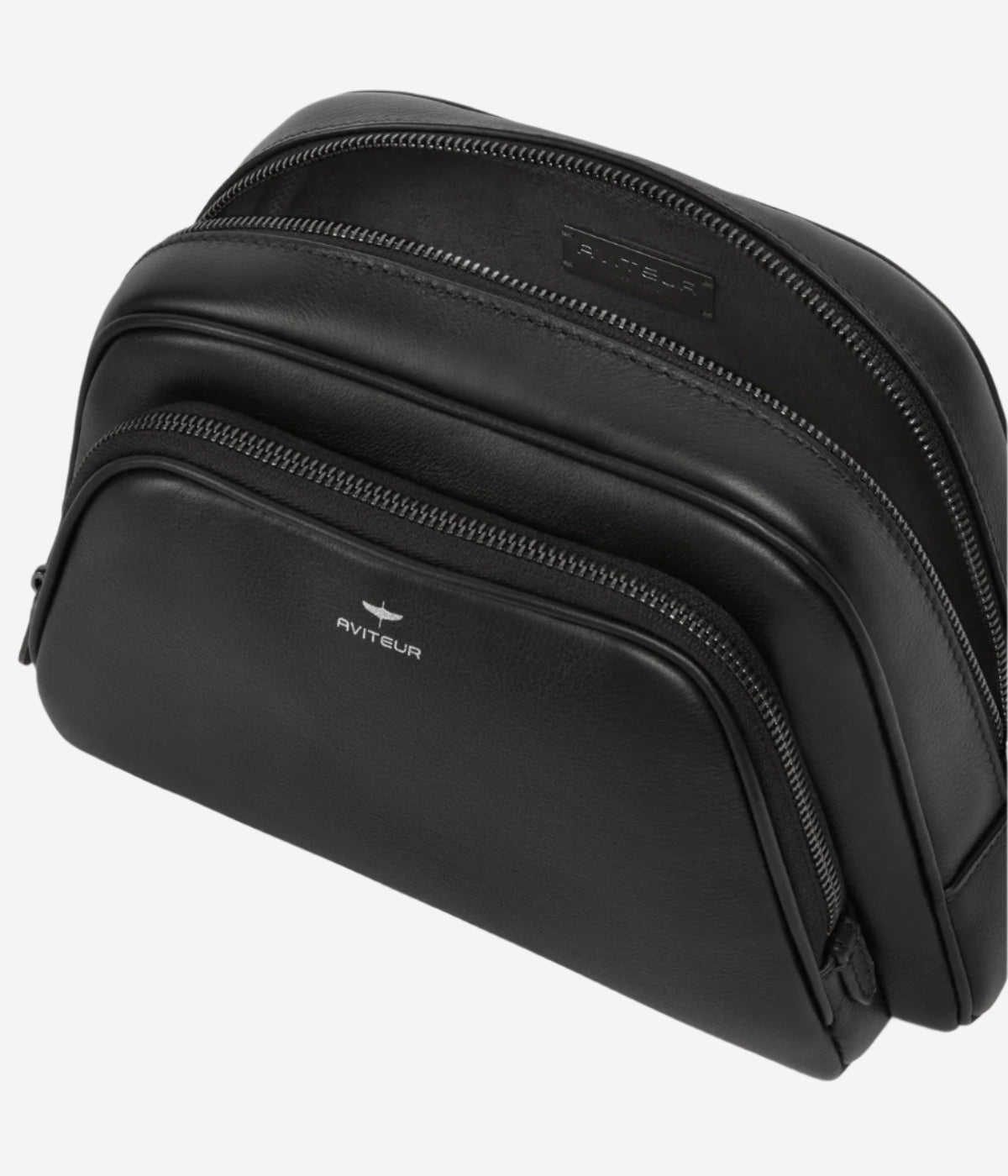 Toiletry Bag in calfskin, lined in washable microfiber. External zipped compartment